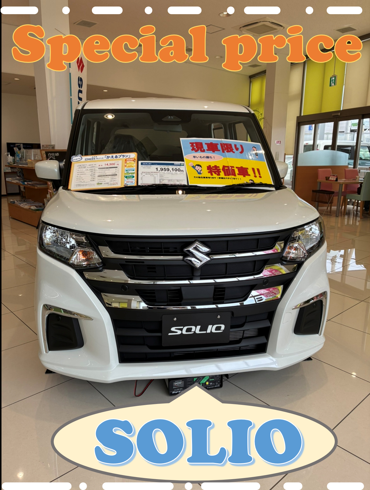 イベント/キャンペーン 2026.04.24 お得なワンプライス車・展示車や試乗車たくさんございます☆彡 みなさまこんにちは 今年の春は、初夏の気温でかなり暖かくなりましたね これからのお出かけシーズン お車の準備は整っていますか?? 正観寺ショールームに展示中の ソリオ掲載させていただきます!! ソリオ HYBRID MG (後席左側ワンアクションパワースライドドア非装着車[受注生産] 全方位モニター付メモリーナビゲーション・スズキコネクト対応通信機装着車) 1200cc/2WD/CVTカラー:ピュアホワイトパール 他にもお買い得車が多数ございます! ↓ご購入相談・試乗相談はこちらから↓