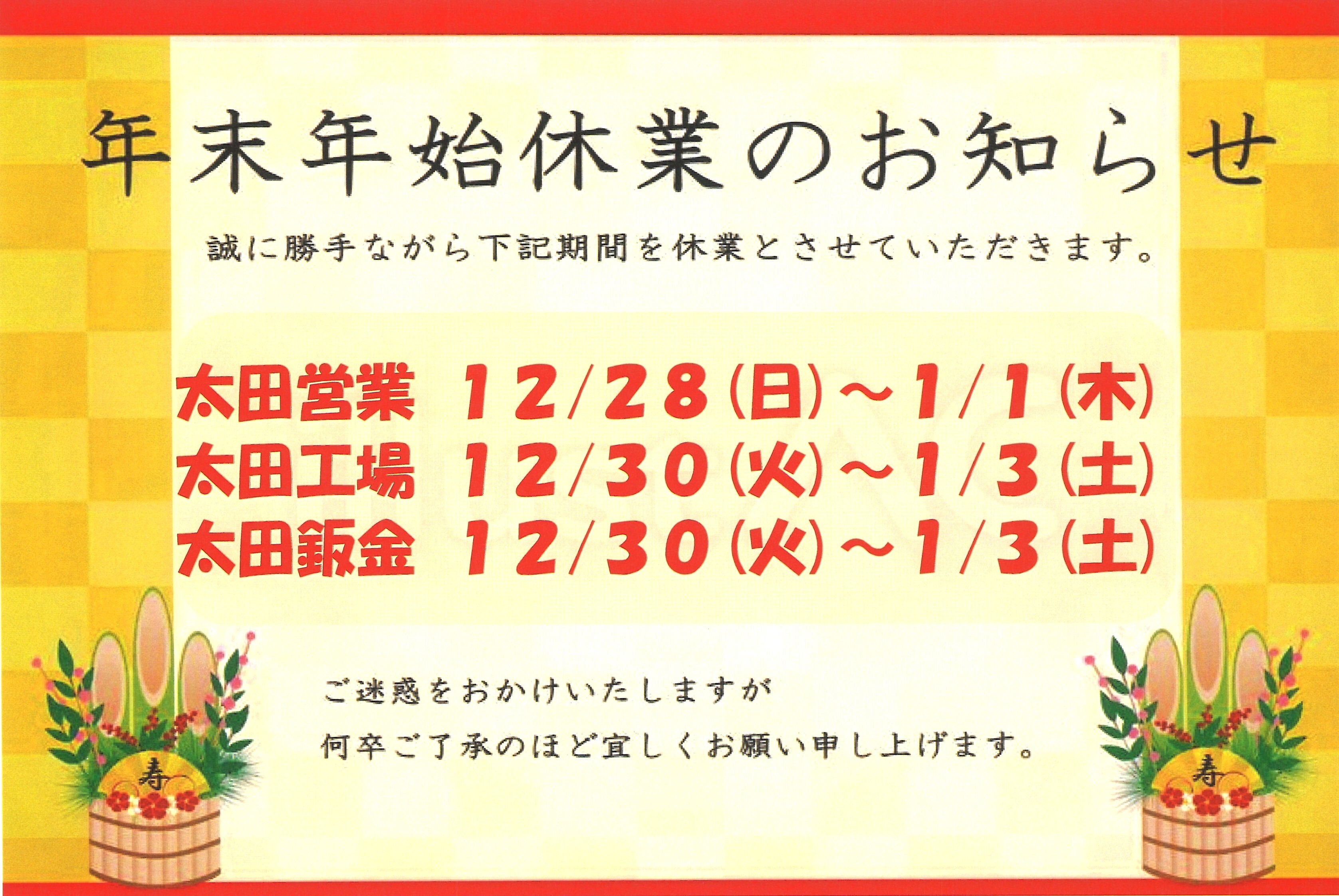 年末年始休業のお知らせ