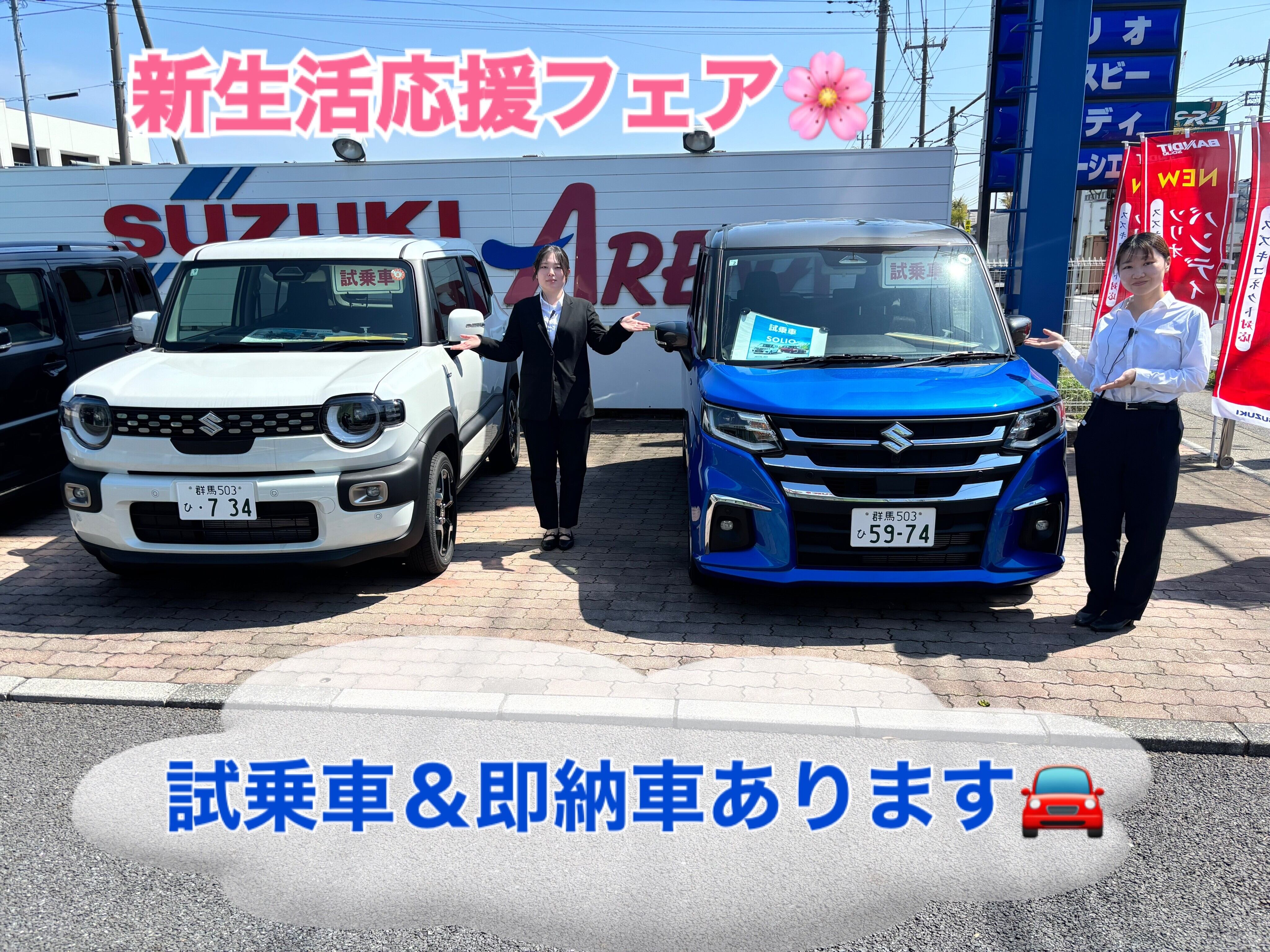 イベント/キャンペーン 2026.04.02 新年度が始まりました! 新年度スタート! 皆様の新生活応援します スズキ自販群馬では お客様ご紹介キャンペーンを開催中! 新生活で新たにお車が必要になることもあるかと思います ぜひご紹介ください ドラレコとナビの同時装着でお安くなるキャンペーンも行っております 詳しくはコチラをご覧いただくか、 当店営業スタッフまでお尋ねください 早めに納車可能な車の一覧です 在庫は変動します。 みなさまのご来店お待ちしております