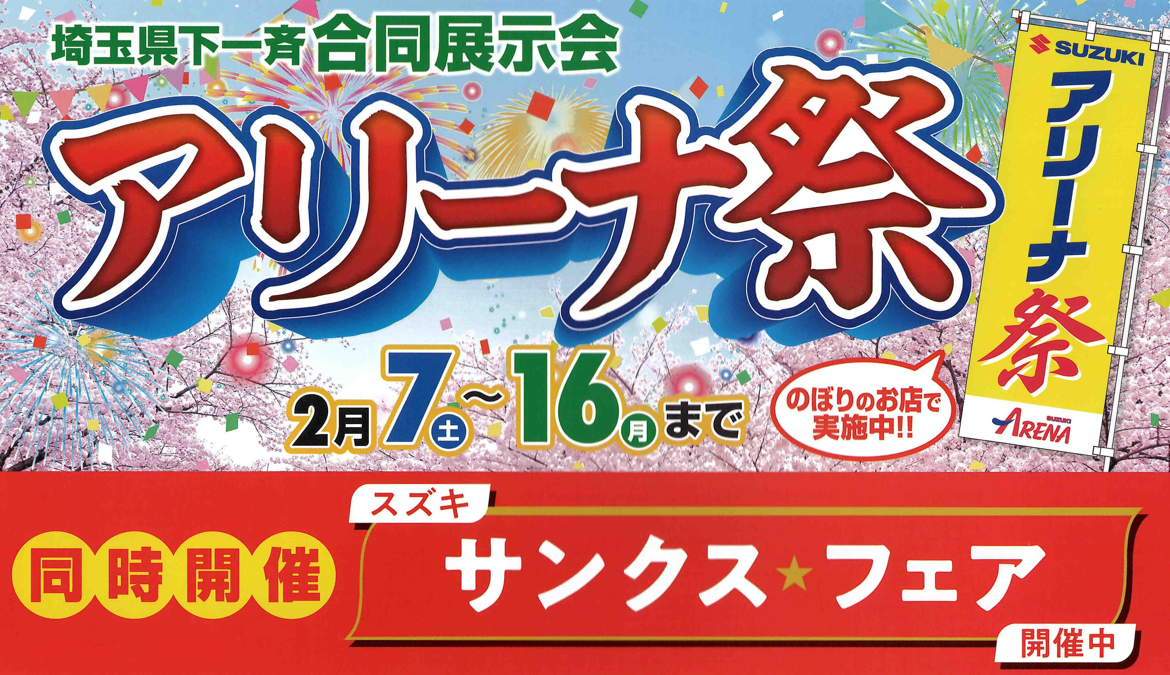 イベント/キャンペーン 2026.02.05 アリーナ祭はじまります! キャンペーン期間:2026.02.07~2026.02.16 みなさま こんにちは 2/7(土)~2/16(月)の期間 アリーナ祭を開催します 上記期間中のご商談やご成約で 素敵なプレゼントもご用意してます ただいまスズキでは 魅力的なおクルマをたくさんごご提案できます 是非この機会に 新しいおクルマにふれてみてください