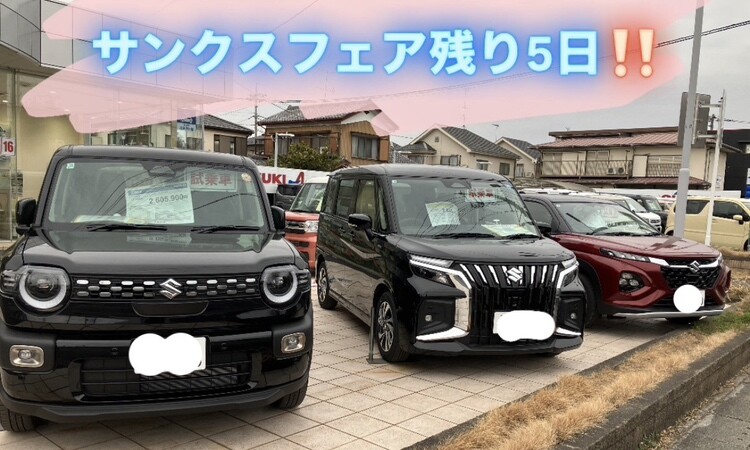 イベント/キャンペーン 2026.03.26 残価設定2,9%今月まで!サンクスフェア残り5日! 残価設定「かえるプラン」特別金利3月31日まで! 皆様、こんにちは! スズキアリーナ蓮田店です! 今週のご案内は、、、 残価設定「かえるプラン」の特別金利です。 スペーシア、スペーシアカスタム、スペーシアギア クロスビー ソリオ、ソリオバンディット こちらの車両の特別金利、2、9%が 今月末で終了!! ご検討中の皆様、ぜひお集まりください!! ご来店心よりお待ちしております!!! サンクスフェア残り5日! サンクスフェア残り5日となりました! 蓮田店、力を入れております! ぜひお立ち寄りください!