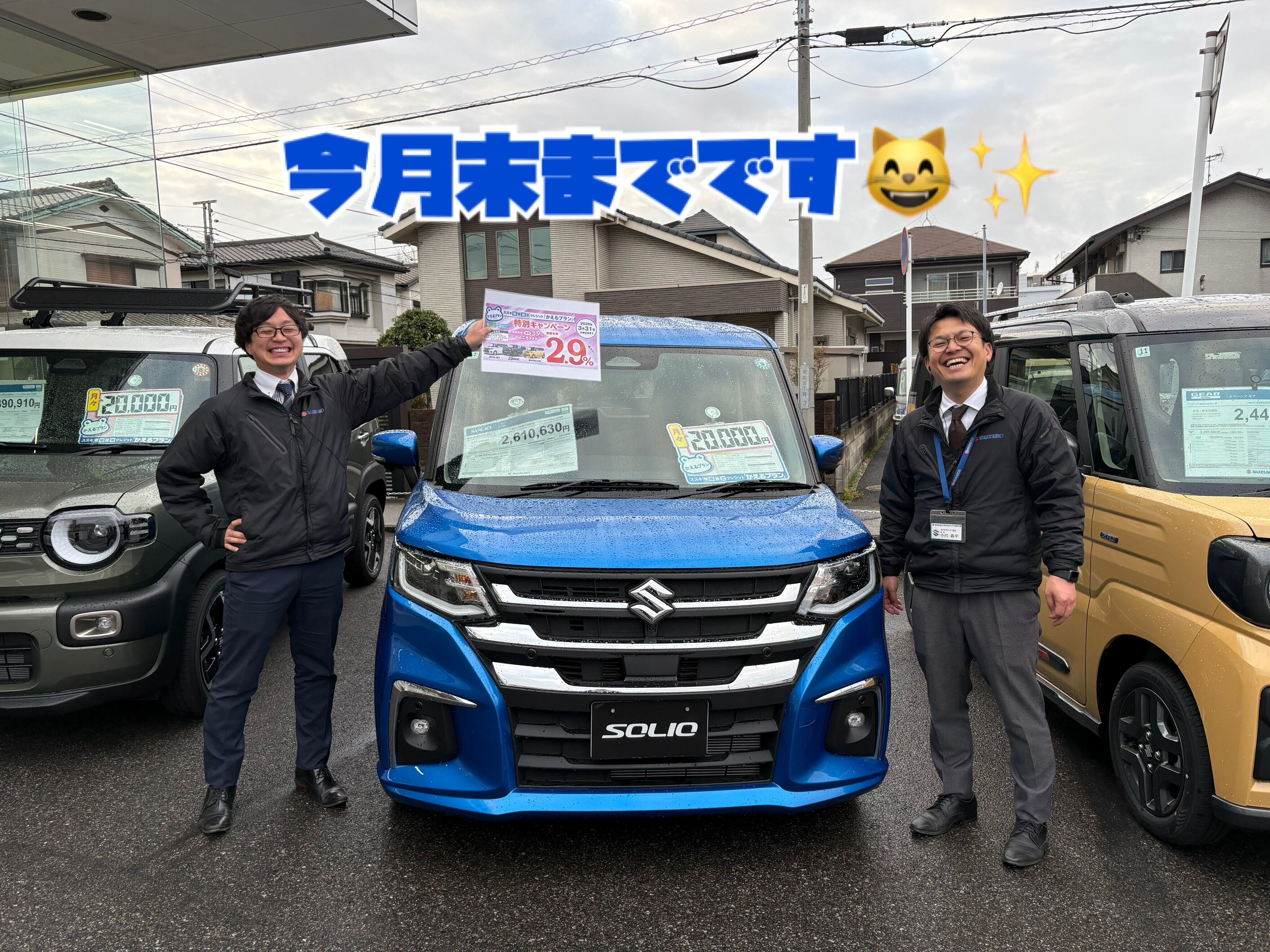 イベント/キャンペーン 2026.03.26 残価設定クレジット かえるプラン特別キャンペーン終了目前!!! 本日も当店のブロブをご覧いただきありがとうございます。 最近は肌寒い日が続いておりますね 皆さんはどうお過ごしですか? 暖かくなるのが待ち遠しいです 現在キャンペーンで行っている スズキ残価設定クレジット かえるプラン特別金利が今月末【3月31日】までの申込となります!! 対象車は 新型クロスビー・ソリオ・ソリオバンディット スペーシア・スペーシアカスタム・スペーシアギア となっております 是非、スズキアリーナ末広店にご来店くださいませ スタッフ一同お待ちしております