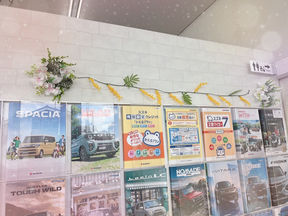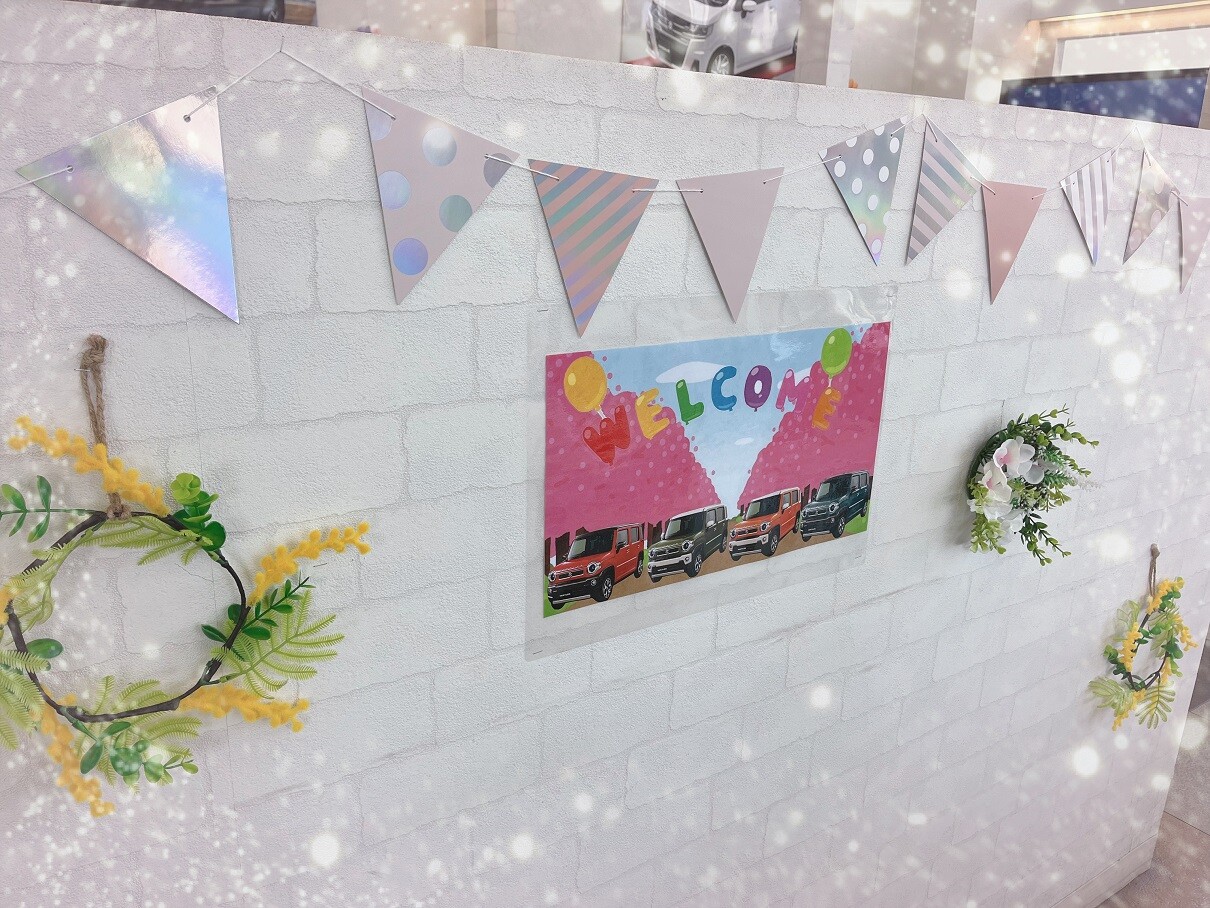 その他 2026.04.06 ☆春のディスプレイ☆ 本日も当店ブログをご覧いただきありがとうございます! 日中はかなり暖かくなり、本格的に春になってまいりましたね 店内の装飾も季節にあわせて春色スタイルにチェンジいたしましたのでご紹介します カタログブースには黄色が鮮やかなミモザとアジサイのリースを 商談スペース付近には春色ガーランドと ハスラー のウェルカムボードを飾り付けました 天気の変わりやすい季節ですが、店内は春色スタイルで皆様をお迎えしております 是非お気軽にご相談・お立ち寄りください
