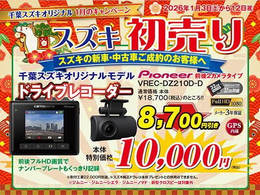 ・千葉スズキオリジナルモデル 前・後・駐車録画 パイオニアドラレコ特価で19,700円(工賃22,000円は別途必要)