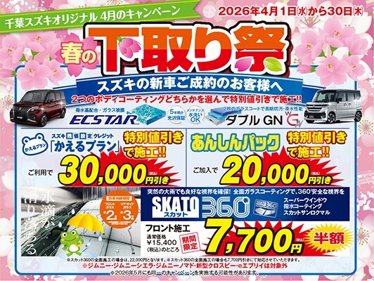 イベント/キャンペーン 2026.03.30 4月 春の下取り祭!! 皆様こんにちは アリーナ美浜の吉澤です いつもアリーナ美浜のHPをご覧いただき ありがとうございます 新年度が始まりますね 早いもので吉澤も入社5年目となりました お客様一人一人にピッタリ合った カーライフのご提案ができるよう 元気いっぱいで務めて参りますので 今年度もどうぞよろしくお願いいたします 前置きが長くなりましたが 4月は春の下取り祭を開催します 大変お得なキャンペーンとなっております ぜひこの機会にスズキの車をご検討してみませんか 皆様のご来店お待ちしております