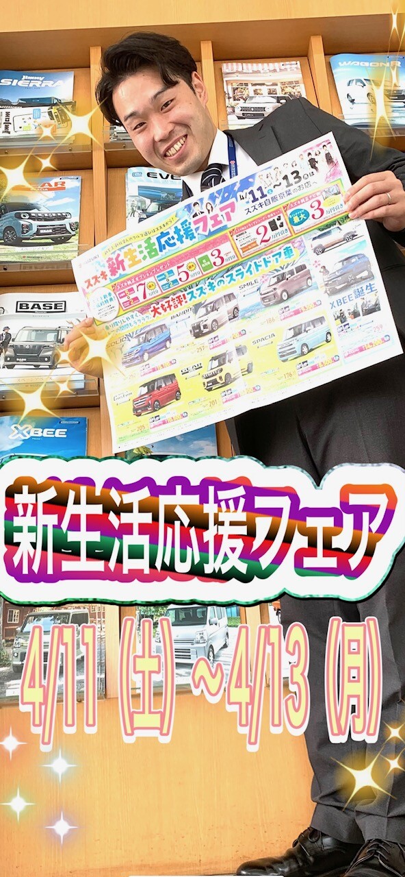 イベント/キャンペーン 2026.04.09 『スズキ 新生活応援フェア』開催します!!! みなさまこんにちは スズキアリーナ千葉東店です 本日のブログはみなさまお待ちかね! 週末イベントの告知となります 『新生活応援フェア』開催いたします 開催期間4月11日~4月13日まで!!! イベント期間中にご成約いただいたお客様を対象に 特別な特典をご用意しております 特典その1: 特典その2: 特典その3: みなさまのご来店をお待ちしております