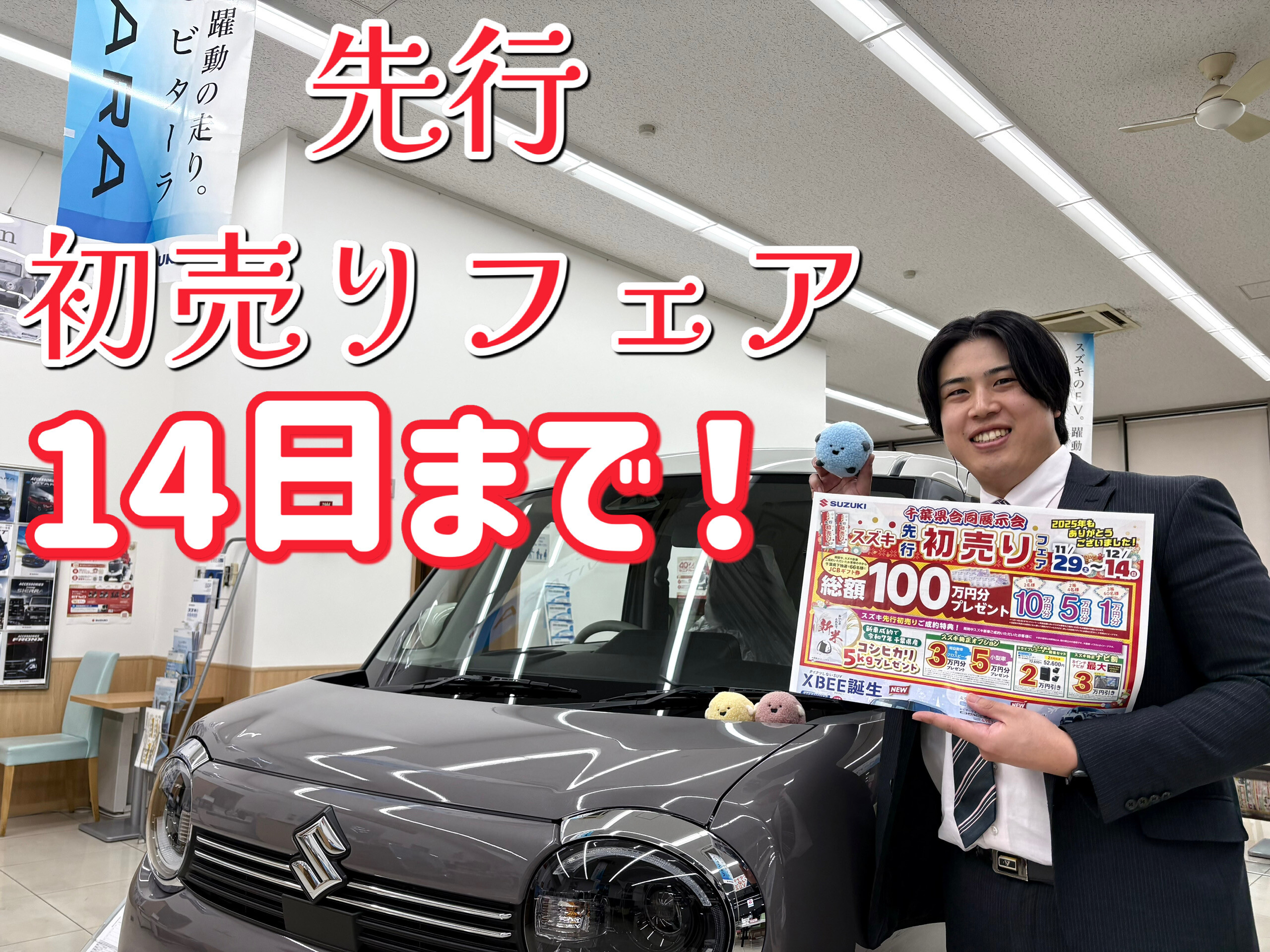 イベント/キャンペーン 2025.12.11 先行初売り残り僅か! こんにちは~ スズキアリーナ松戸です 先週より開催中の 先行初売りフェアも 今週末14日までとなります お得な成約特典 オプションプレゼントや新米のプレゼントなどなど 是非この機会に新車ご購入をご検討ください 初売りと同様のキャンペーンです 週末は是非当店へお越しください! ご来店お待ちしております