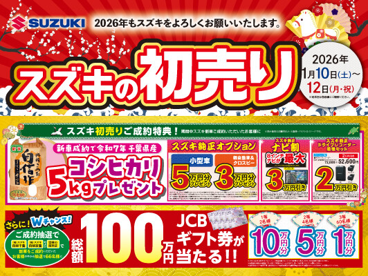 イベント/キャンペーン 2026.01.08 初売り後半戦!! こんにちは 1月4日からの初売りはたくさんのお客様がご来店を頂き 大盛況で終わることができました!! 本当にありがとうございます。 12日まで初売りは実施しております。 ご成約キャンペーンでお米のプレゼントやJCBギフト券の抽選なども 実施しております。 皆様のご来店をお待ちしております。