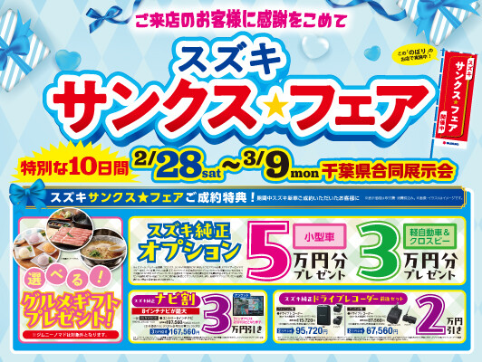 イベント/キャンペーン 2026.02.26 2月28日からサンクスフェア開催!! こんにちは 2月28日から3月9日まで スズキのサンクスフェアを開催致します!! ご成約特典たくさん用意しております。 1、選べるグルメギフトのプレゼント 2、スズキ純正オプションプレゼント 小型車5万円、軽自動車クロスビー3万円 3、ナビゲーション割引 4、スズキ純正ドライブレコーダー割引 1か月位でご納車できる車両も沢山ございます! ぜひ一度ご相談下さい! 皆様のご来店をお待ちしております。