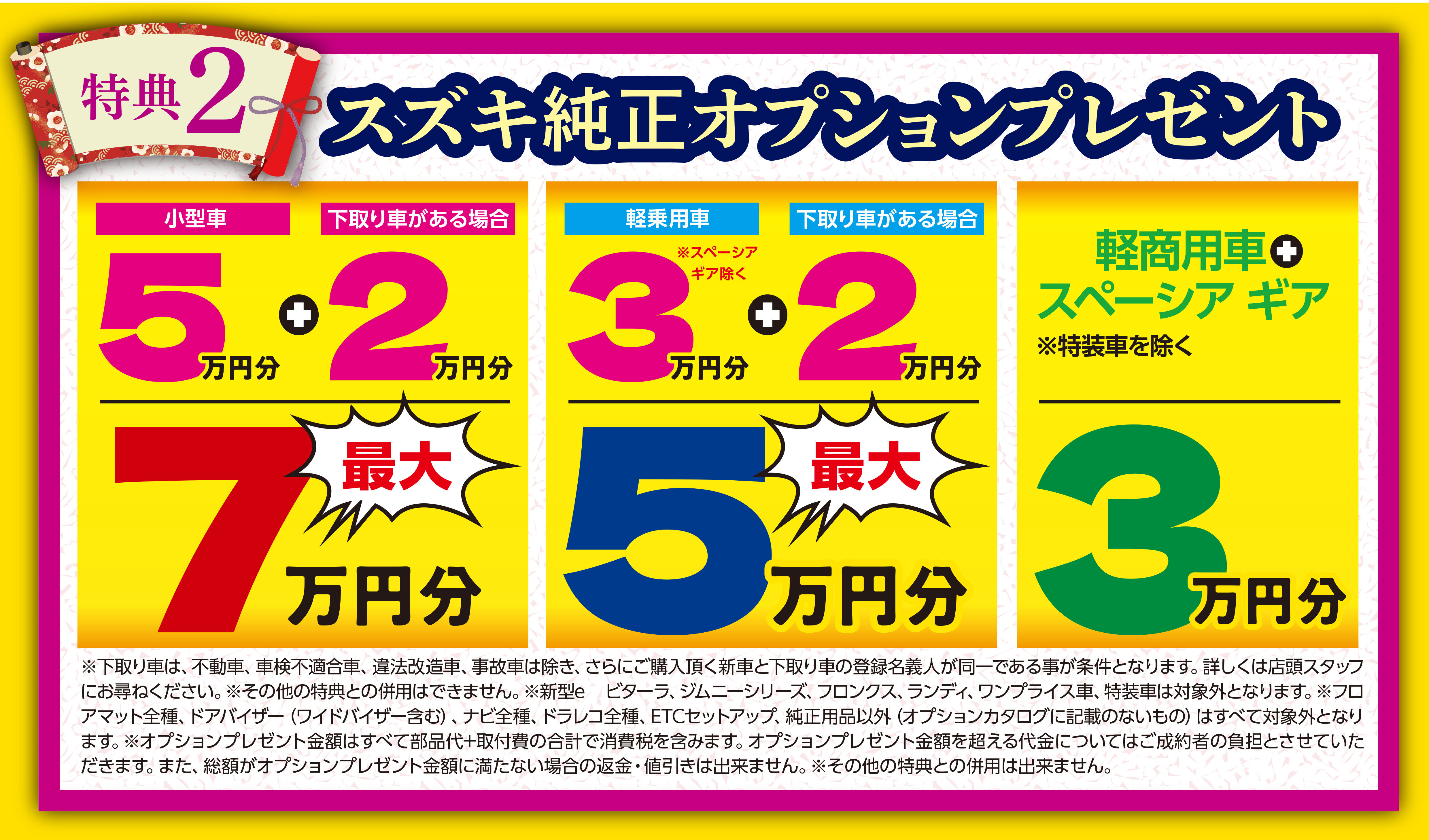 イベント/キャンペーン 2026.01.15 スズキ初売りアンコールフェア開催☆彡 キャンペーン期間:2026.01.17~2026.01.19 こんにちは スズキアリーナ八街のすずきです 初売りではたくさんのお客様にご来店いただき 誠にありがとうございました ご好評につき スズキ初売りアンコールフェア開催します 開催期間:1月17日(土)から19日(月) 期間中、スズキの新車ご成約いただいた方に 特典1 コシヒカリ5㎏プレゼント 特典2 スズキ純正オプションプレゼント 特典3 スズキ純正ドライブレコーダー 前後セット特別値引き 特典4 スズキ純正ナビ割り みなさまのご来店お待ちしております