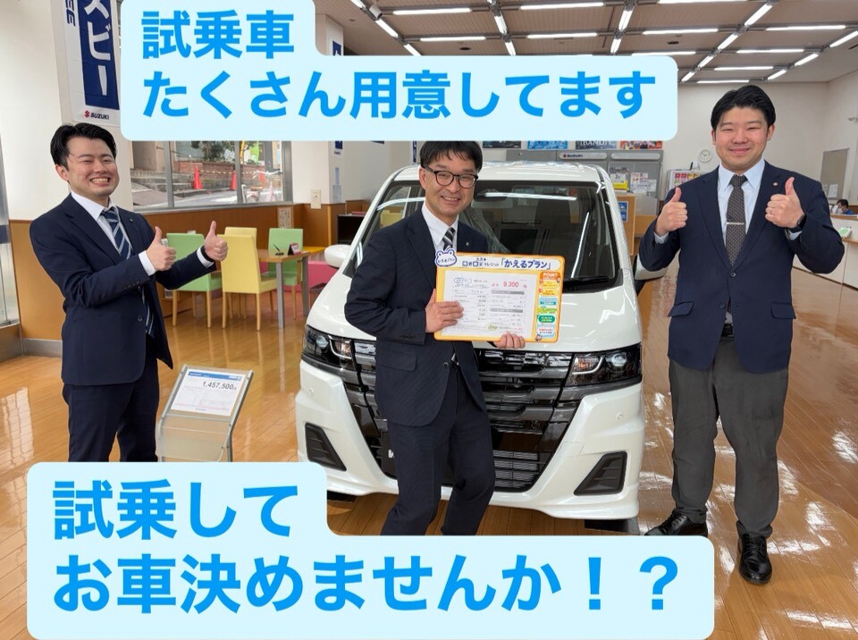 その他 2026.01.29 お車試乗して決めませんか? お車試乗してみませんか 当店試乗車たくさんご用意がございます 今話題沸騰中のクロスビーもご用意がございます 他にも大人気なハスラーやジムニーなども ご用意がございます 新しくなったばかりのワゴンRも試乗車 がございます 展示車でもワゴンRご用意がございますので 運転はしなくてもという方もご安心ください 気になるお車ございましたら是非試乗してみてください 今週末もアリーナ文京でお待ちしております