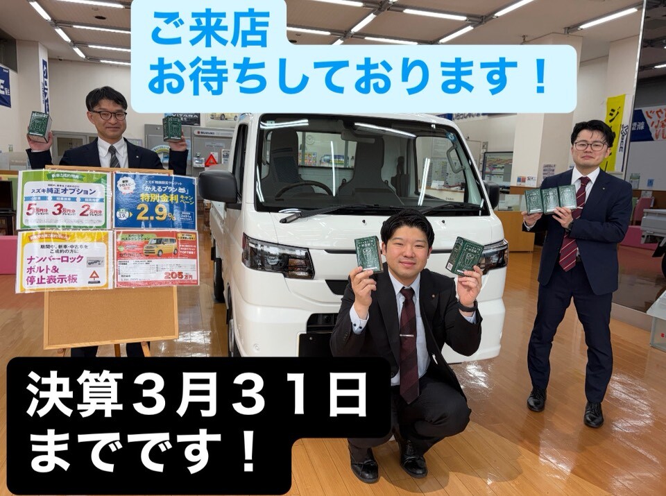 イベント/キャンペーン 2026.03.26 3月決算最終週です!かえるプラン特別金利も3月31日までです キャンペーン期間:2026.02.14~2026.03.31 2月から開催している決算イベントも 後6日で終了です イベント開催中にお得にお車購入しませんか 商談プレゼントもご用意してます 気になるお車ございましたら 是非お問い合わせください 試乗車展示車も用意しております 3月決算最終週 皆様のご来店お待ちしております