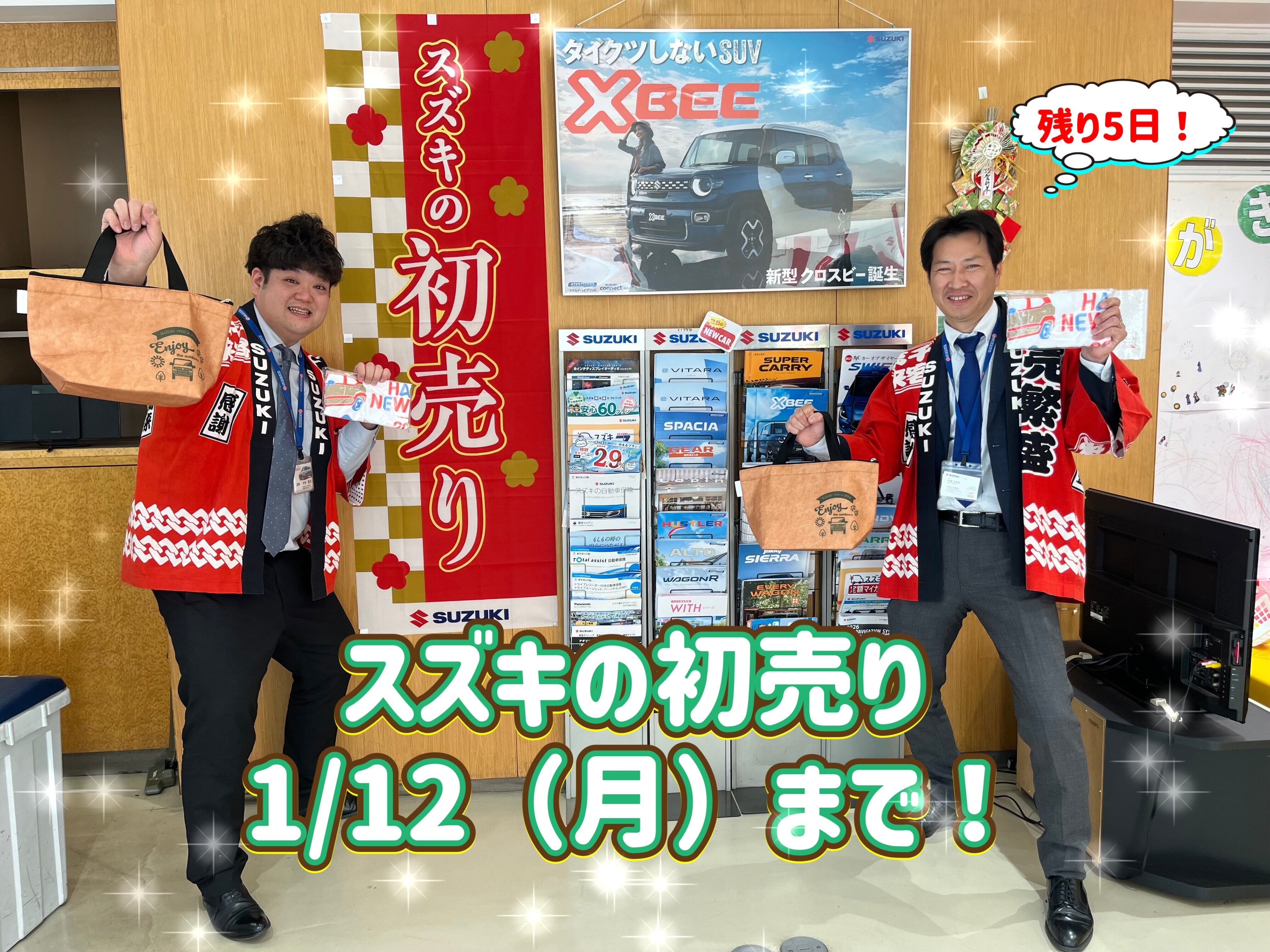 イベント/キャンペーン 2026.01.08 スズキの初売りは1/12(月)まで! 明けましておめでとうございます 本年も初日から多くの方にご来場いただき ありがとうございます 只今、ここ馬込店では 「スズキの初売り」 を1/4(日)~1/12(月)まで 開催しております 年明け気持ち新たにスズキの新車を 迎え入れて頂きたいと思っております その際はぜひ当店までご連絡くださいませ イベント期間中にお越し頂けると、、、 ご来場プレゼント ご商談プレゼント ご成約プレゼント 各種ご準備しておりますので お気軽にご連絡くださいませ 皆様にとって素敵な一年となるよう 心からお祈り申し上げます 残り5日ですが皆様のご来店 心よりお待ちしております