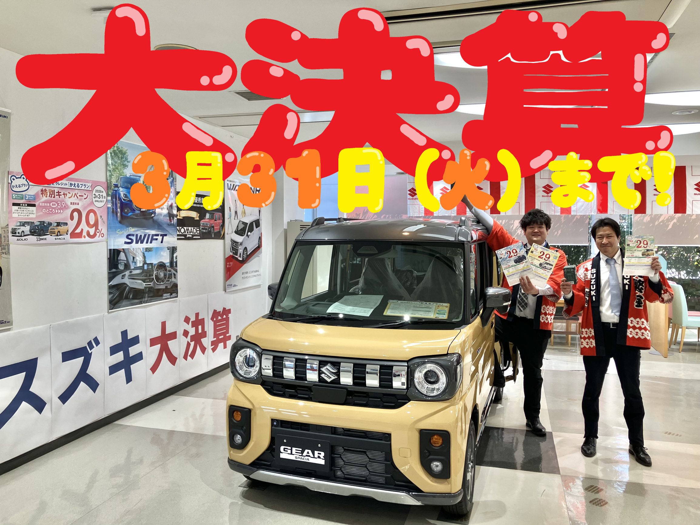 イベント/キャンペーン 2026.03.26 スズキの大決算も残すことあと、、6日!! いつも当店のホームページを ご覧いただきありがとうございます 3月31日(火) スズキの大決算終了が近づいて参りました まだ新車決め切れていないお客様 忙しくてやっとお車ご検討し始めたお客様 お乗り換えしようかお悩みのお客様 あと6日です 是非、この機会にスズキ車の ご検討をお願いします ※かえるプラン 特別金利2,9%は (対象車種:ソリオ、クロスビー、スペーシア) 今月のお申込みが期限となっております 馬込スタッフ一同、皆様のご来店を 心よりお待ちしております
