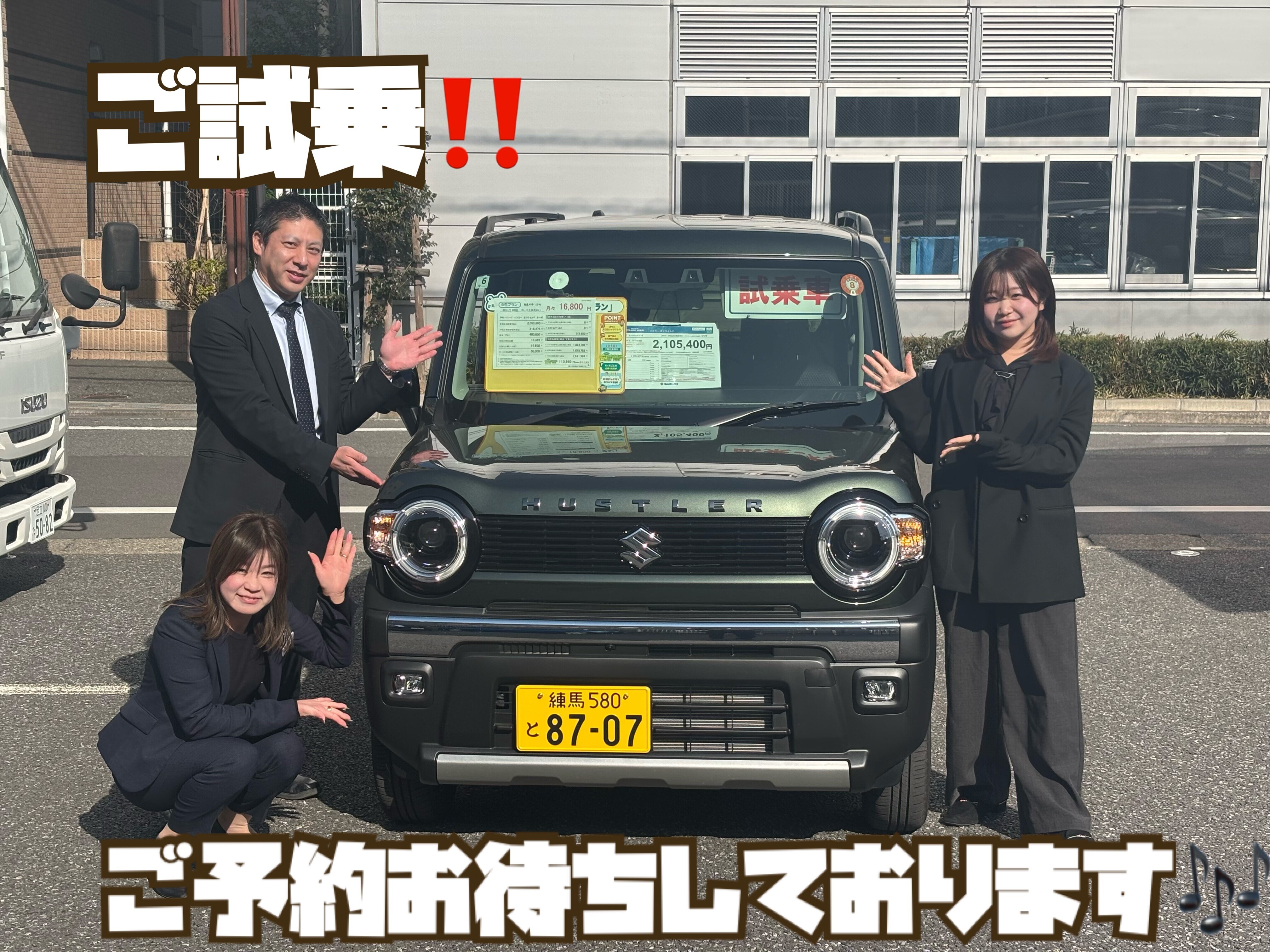 その他 2026.01.29 試乗車ハスラー! こんにちは スズキアリーナ練馬店でございます 週末は是非練馬店へ 試乗のご予約お待ちしております 人気の軽自動車 ・ハスラー ・スペーシア ・ワゴンR ・ワゴンRスマイル ・アルト 置いてありますので是非ご来店ください! ご予約のお電話いただけますとスムーズにご案内できます 03ー3993ー4331 スタッフ一同お待ちしております!!