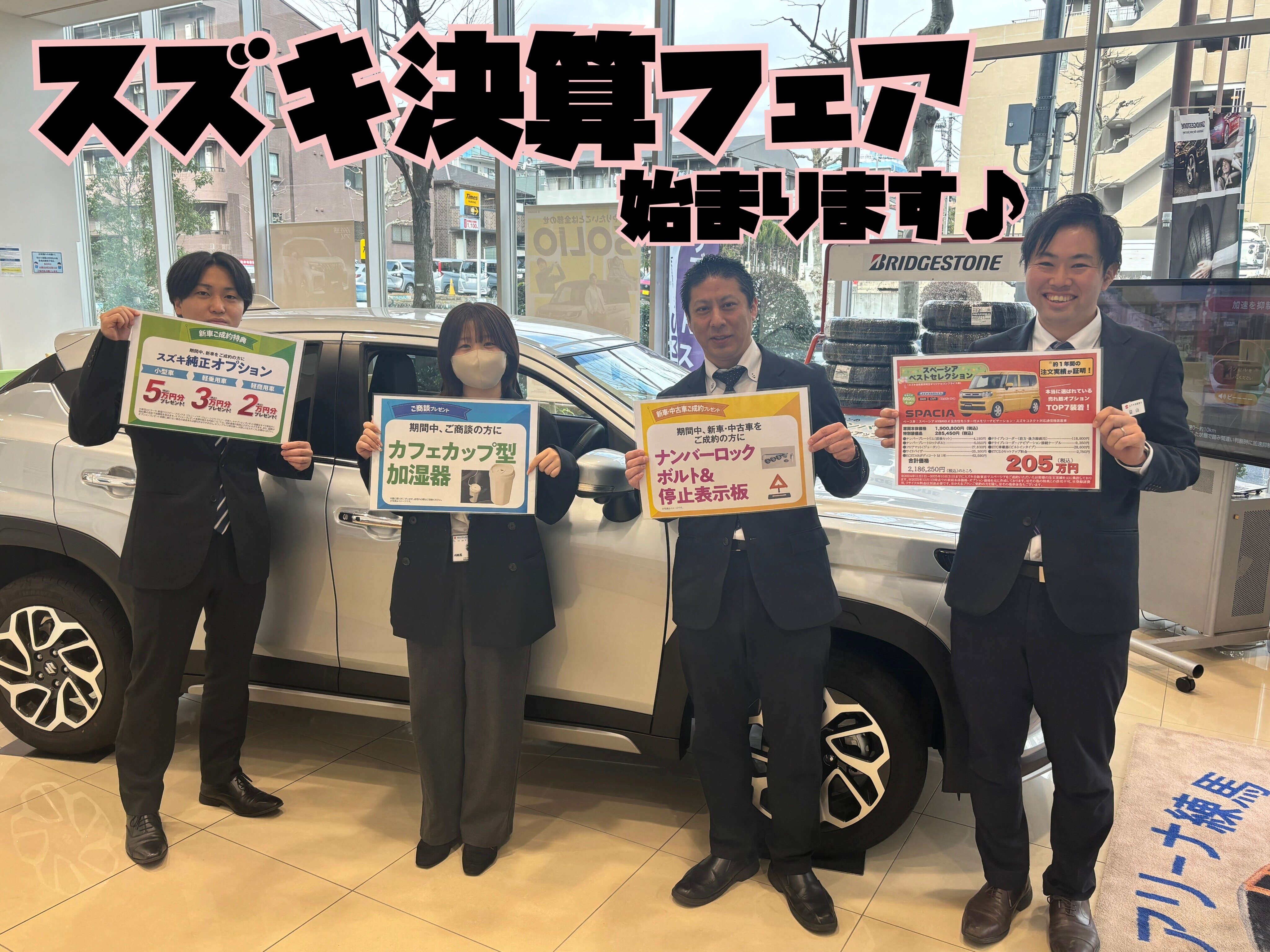 イベント/キャンペーン 2026.02.14 スズキ大決算始まります! キャンペーン期間:2026.02.14~2026.03.31 こんにちは スズキアリーナ練馬店でございます 今年もスズキ大決算フェア始まります 2月14日~3月31日まで行っています! 期間中、新車ご成約の方に スズキ純正オプションプレゼント 新車・中古車をご成約の方に ナンバーロックボルト&停止表示板プレゼント 期間中ご商談の方に カフェカップ型加湿器プレゼント 皆さまのご来店お待ちしております!!!