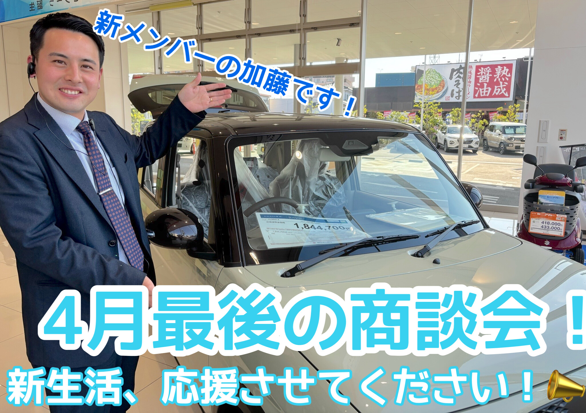 イベント/キャンペーン 2026.04.16 4月商談会! こんにちは! スズキアリーナ青梅店です! 4月も中盤ですね! 私の最近の毎日の楽しみはアイシールド21です! 実際のアメフトの試合を観に行きたくなってしまったので 5月の開幕までわくわく待ってます! さて!4月もお得な商談会! ご成約特典いっぱい! 新生活応援させてください! 皆様のご来店を心よりお待ちしております!