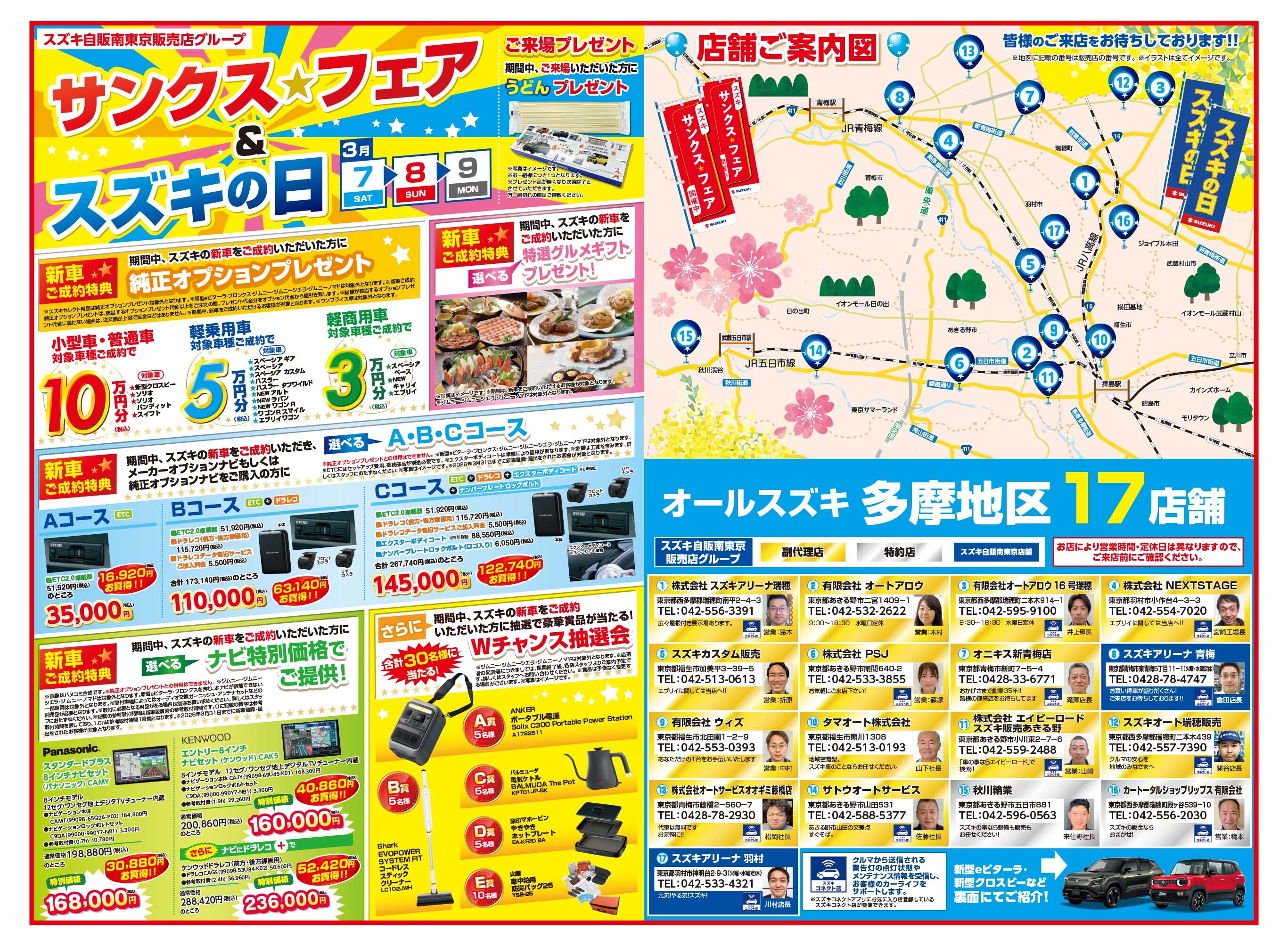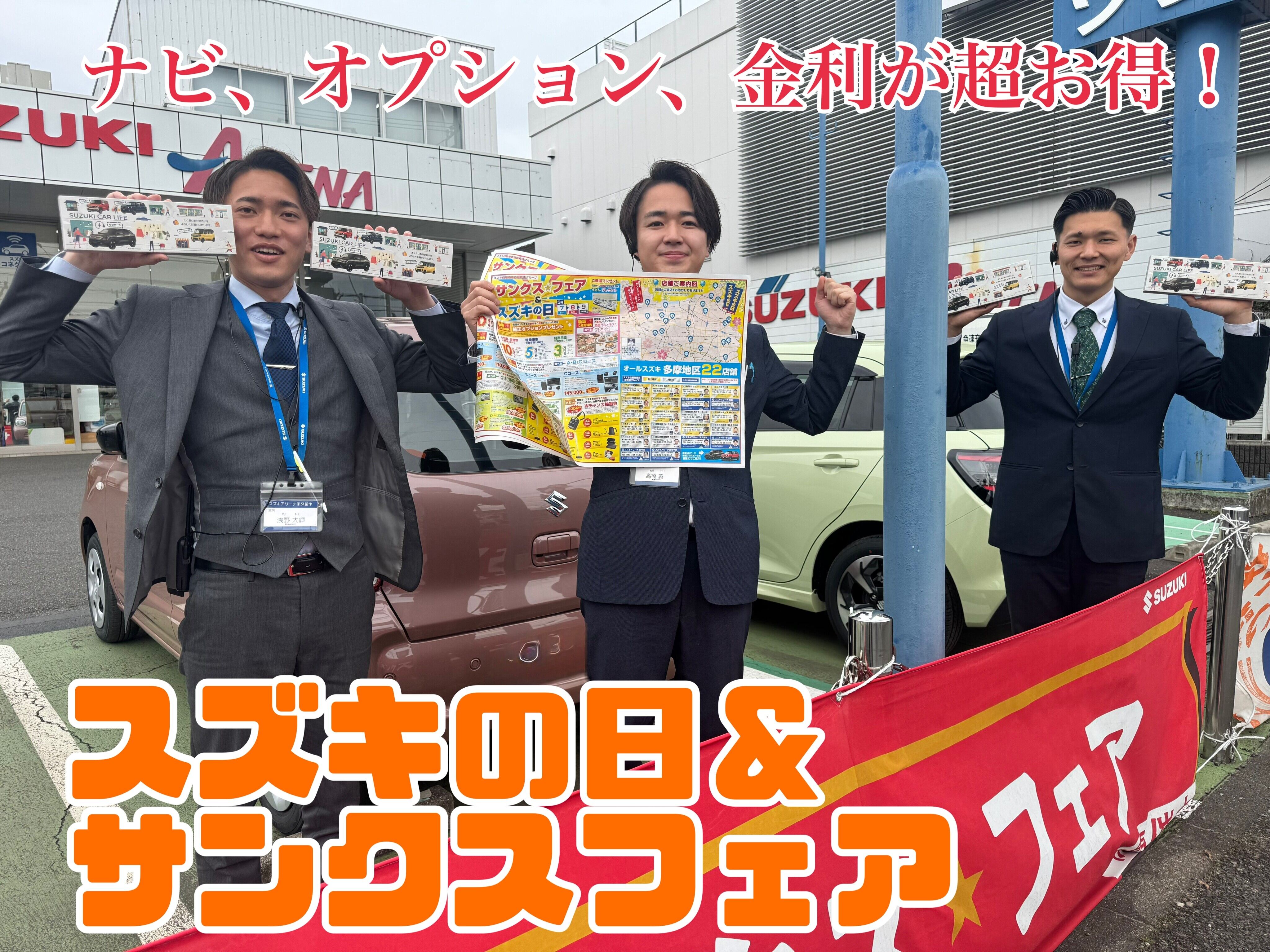 イベント/キャンペーン 2026.02.27 スズキの日&サンクスフェア!ナビやオプションが超お得!! スズキの日&サンクスフェア!! いつも東久留米店のブログを ご覧いただきありがとうございます! スズキの日&サンクスフェア! ナビやオプションが超お得!! ご成約特典! オプションプレゼント! 選べるABCコースでとってもお得!! ナビもお得! Wチャンスで ご来場プレゼントも! 皆様のご来店を東久留米スタッフ一同 心よりお待ちしております!!