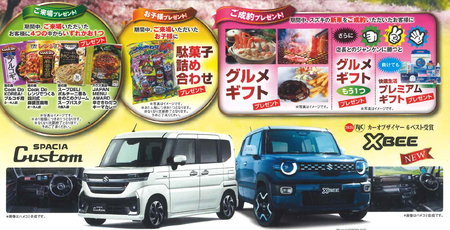 イベント/キャンペーン 2026.04.13 感謝祭 いつもホームページをご覧いただき ありがとうございます 新車営業の松村です なんと、、、 今週末より大感謝祭を開催します 大感謝祭 開催 期間:4月18日(土)~4月26日(日) ①ご来場プレゼント プルコギ、麻婆豆腐、きのこクリームパスタ、キーマカレー ②お子様プレゼント 駄菓子詰め合わせ ③ご成約プレゼント グルメギフト ジャンケンに勝つと、、 グルメギフトもう1つ or プレミアムギフト お車の相談、ご試乗大歓迎です!! 皆様のご来店スタッフ一同お待ちしております!!