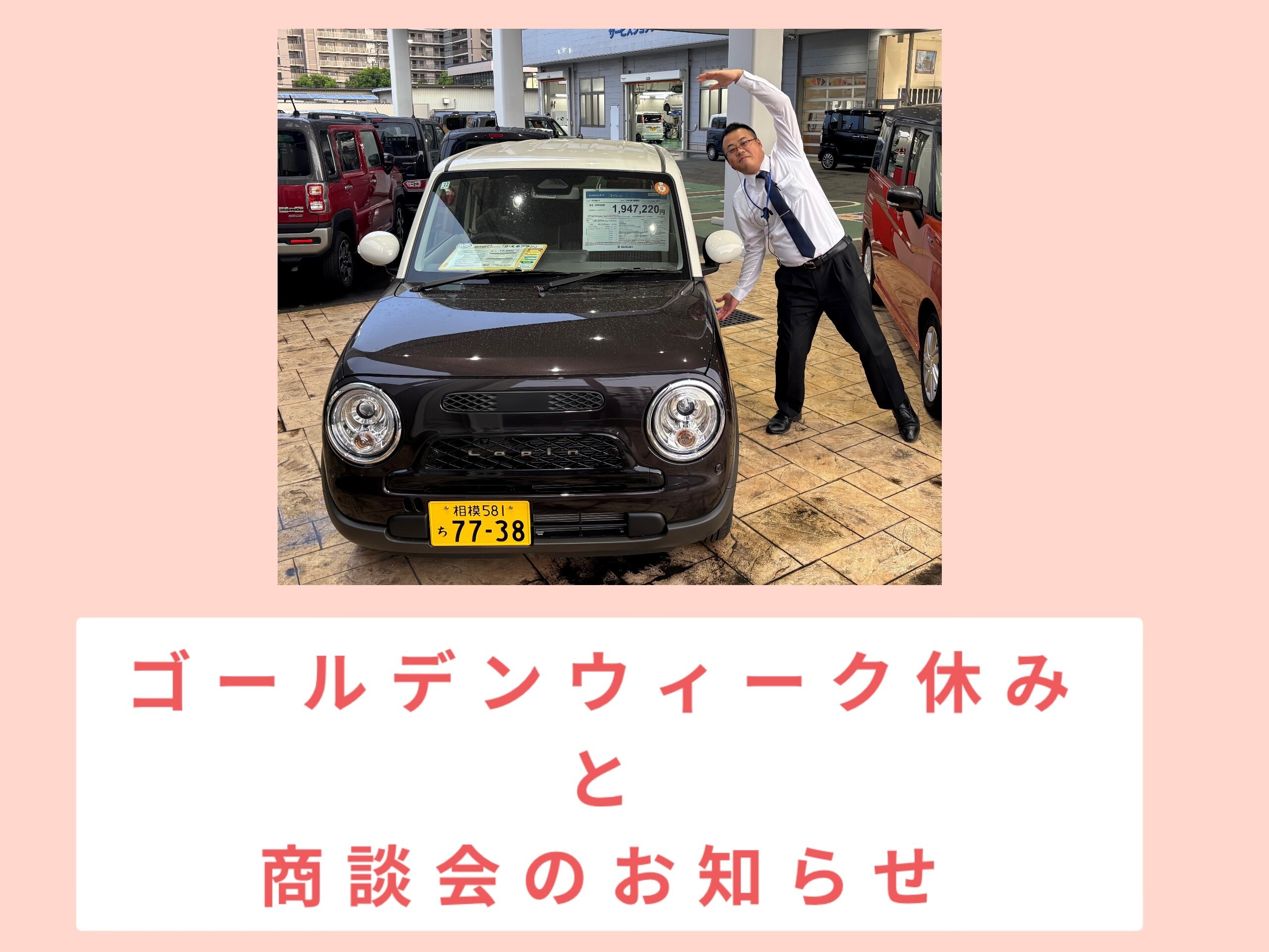 イベント/キャンペーン 2026.04.27 商談会とゴールデンウイーク休みのお知らせ! こんにちは! 営業のたかぎです! 皆さんゴールデンウイーク休みはどこかお出かけされますか? 私はBBQを予定しています さて、 今回は当店のゴールデンウイーク休みのご案内です 当店は 5月2日(土)~5月6日(水)の期間中休業いたします。 ご不便をおかけしますが何卒よろしくお願いいたします 7日(木)からは元気に営業再開いたします 9日(土)10日(日)は商談会を開催いたしますので 是非ご来店ください ご来店、ご試乗予約は こちら から 046-240-0020