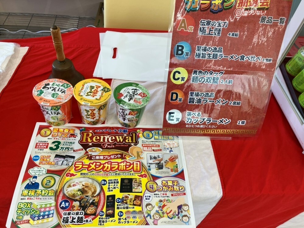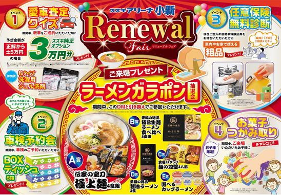イベント/キャンペーン 2026.03.09 リニューアルイベントは3月15日まで! 皆さま、こんにちは! スズキアリーナ小新店です 当店では現在、リニューアルフェアを開催中です 3月7日(土)、8日(日)はご盛況いただき、誠にありがとうございました!! ガラポン抽選会にご参加いただいた皆様!ぜひラーメンの感想お待ちしております! 併せてスズキ自販新潟ではサンクスフェアも開催中です! マットやドアバイザー、ETC車載器などのオプションセットをお得な値段でご提供させて頂きます。 こちらのイベントは15日(日)まで開催中ですのでお気軽にご来店ください!