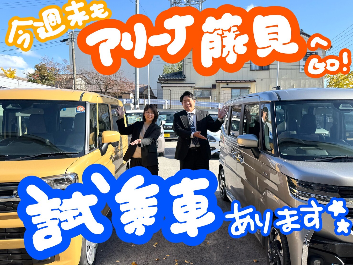 イベント/キャンペーン 2025.11.14 大人気スペーシアの試乗車もありますよ~! こんにちは! アリーナ藤見の山本です 感謝フェア開催中です 軽乗用車ご成約で・・・ オプション3万円+お肉プレゼント または スタッドレスタイヤ&スチールホイールプレゼント 登録車ご成約で・・・ オプション5万円+お肉プレゼント! さらに・・・ 新型車、続々登場中です! スペーシアやハスラー、ソリオといった 様々な試乗車もご用意しております スタッフ一同、 アリーナ藤見店にてお待ちしております!