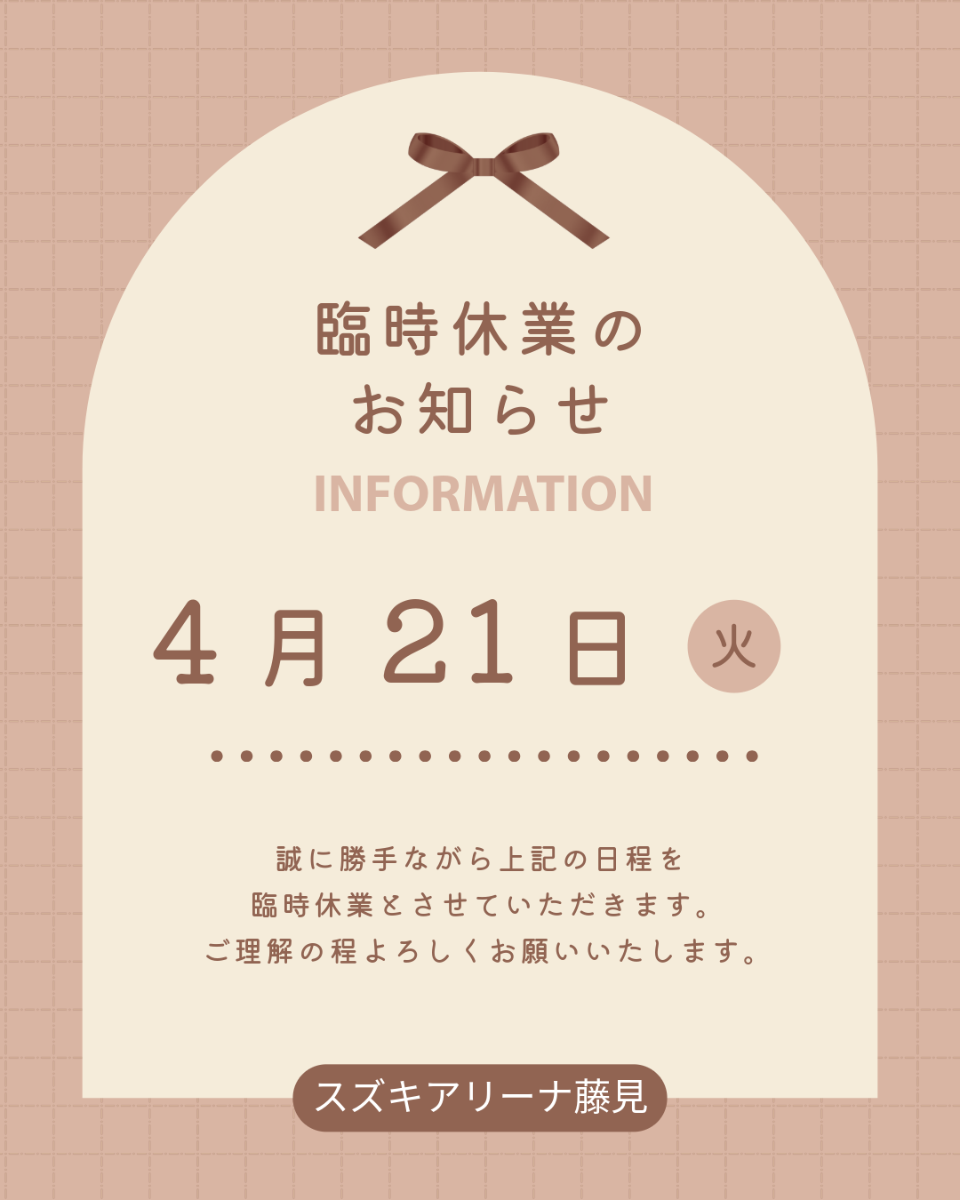 誠に勝手ながら4月21日(火)は終日社内研修のため臨時休業とさせていただきます。