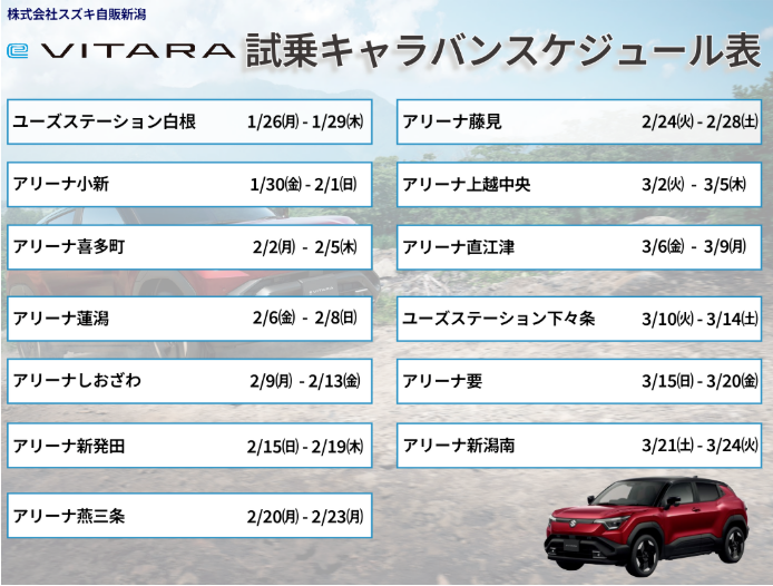新車情報 2026.03.03 【速報】eビターラが上越中央点にやってきました!!! 毎度ブログをご覧いただきありがとうございます この度、スズキアリーナ上越中央店に eビターラがやってきました スズキ初の電気自動車をぜひ見て触って乗ってご体感ください 実車は3/5(木)まで当店でご覧いただけます ぜひこの機会にスズキアリーナ上越中央店へ