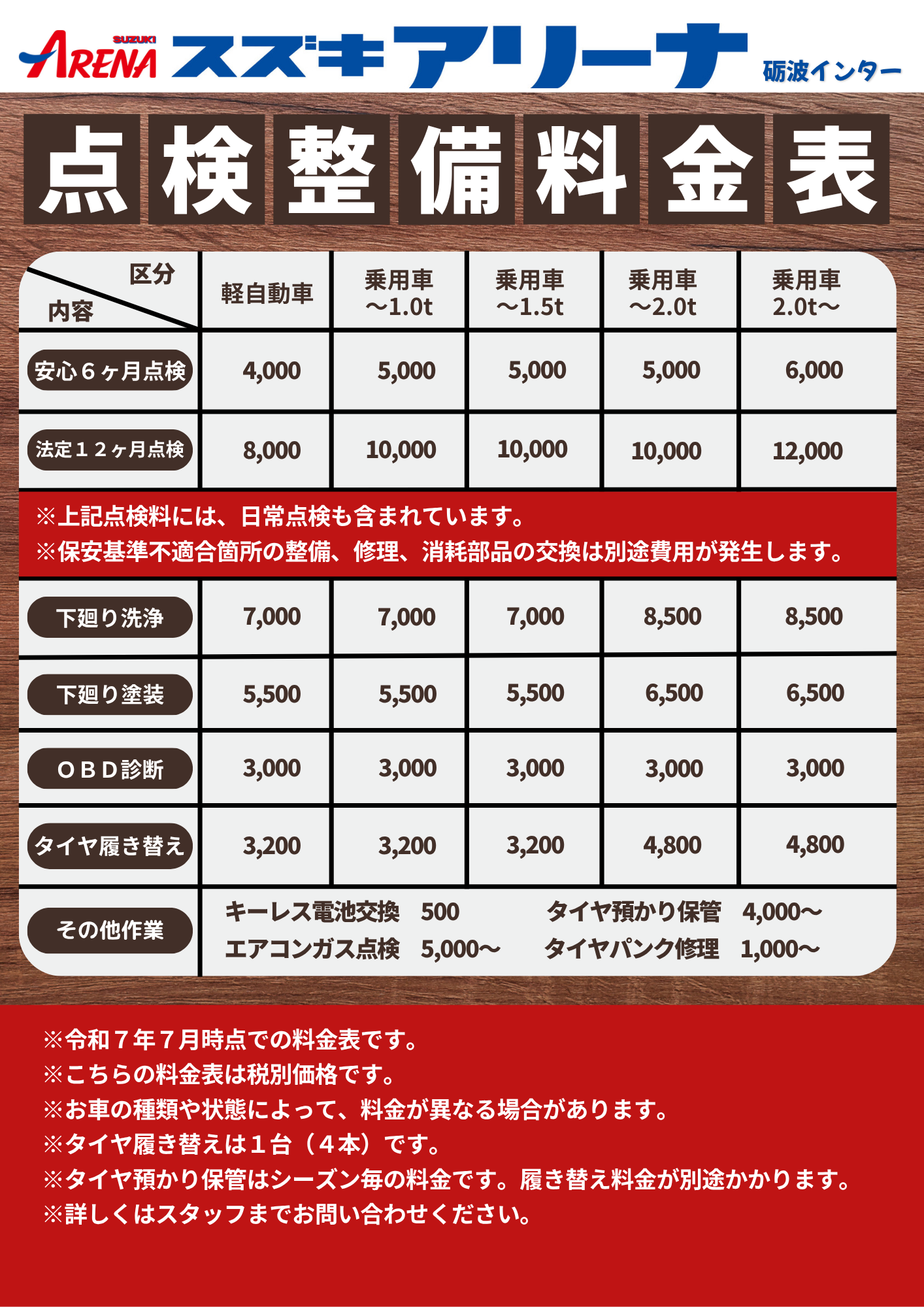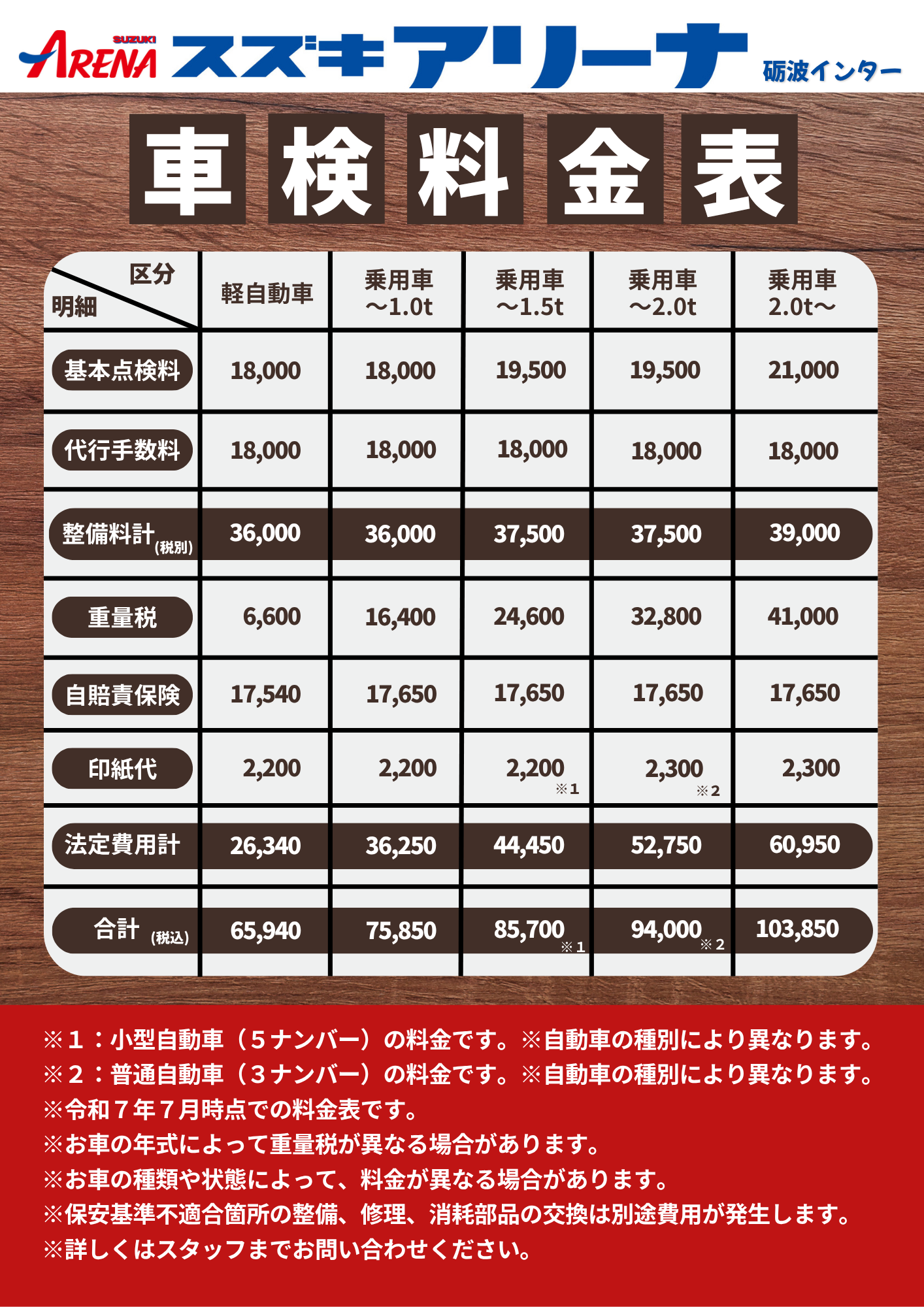スズキアリーナ砺波インターの車検料金表と点検整備料金表です。