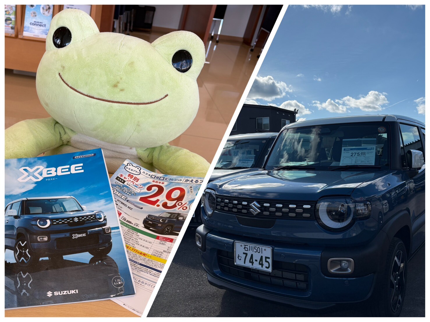 新車情報 2025.10.24 新型クロスビー特別金利キャンペーン実施中~! 皆様、お久しぶりです 朝晩が冷え込む季節になってきました 今日のお知らせは、 スズキ残価設定クレジット「かえるプラン」 XBEEだと今なら 特別金利 2.9%でお申し込みできます (通常は3.9%です) 申込期間は2026年3月31日までになりますので この機会にお話ししてみませんか? 試乗車もございます カタログ表紙を飾っている ミスティックブルーメタリック ホワイト2トーンルーフ をご用意しております 新色になりますので、気になる方、ぜひ見に来て下さ~い 今週末も元気に営業しております