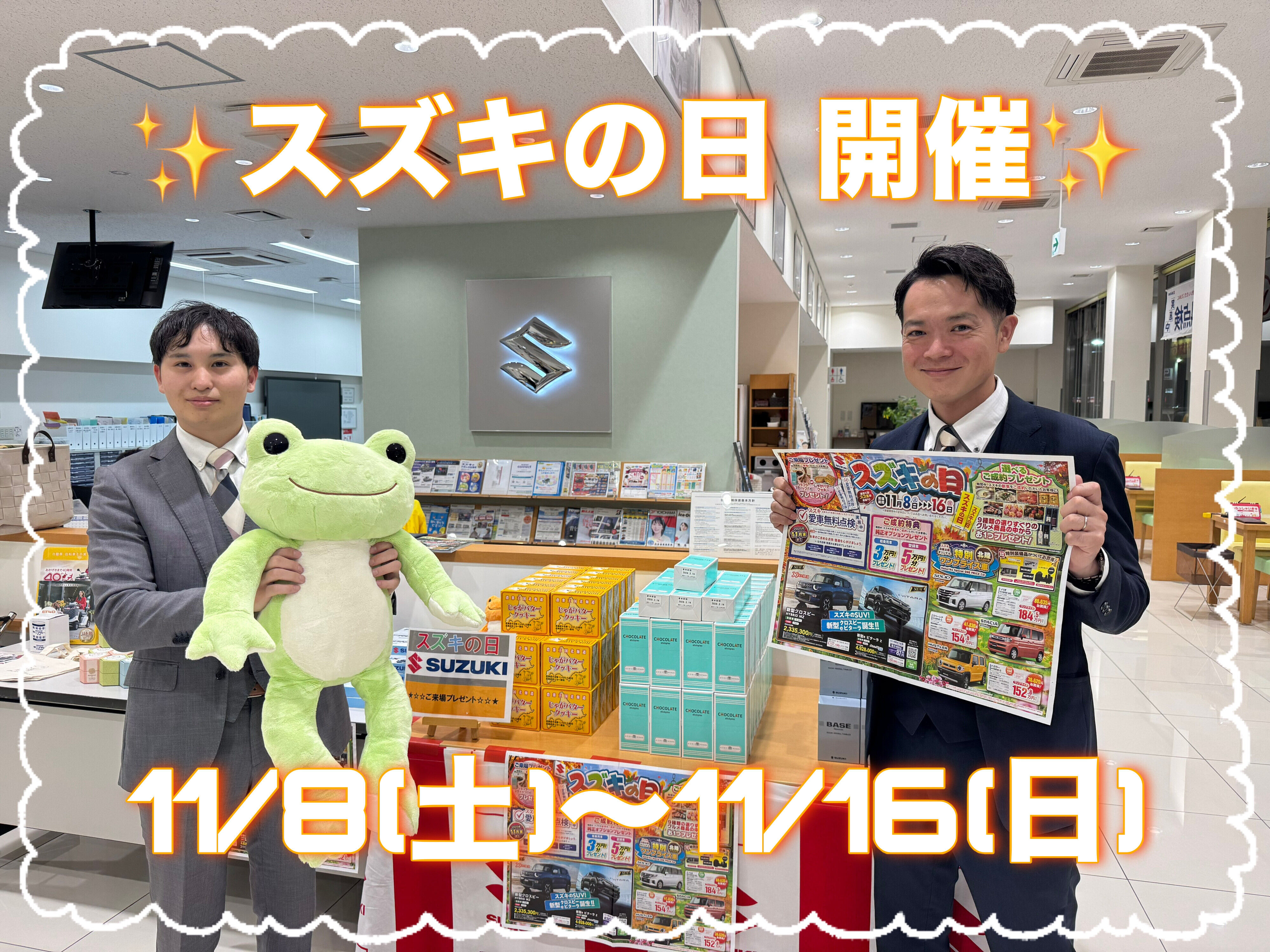 イベント/キャンペーン 2025.11.07 8日からはスズキの日! みなさま こんにちは! 営業のちばです スズキでは、 11月8日(土)~11月16日(日)の期間 『スズキの日』 を開催いたします!! 期間中に 新車をご成約いただいた方には 9種グルメ商品の中から おひとつプレゼント ご用意しております! また、 ご来場いただいた方には 2種から選べるお菓子を プレゼントさせていただきます! 少しでも気になっていただけましたら、 お気軽に ご来店ください! スズキの日最終日、16日には、 eビターラの展示もございます! ご来店お待ちしております