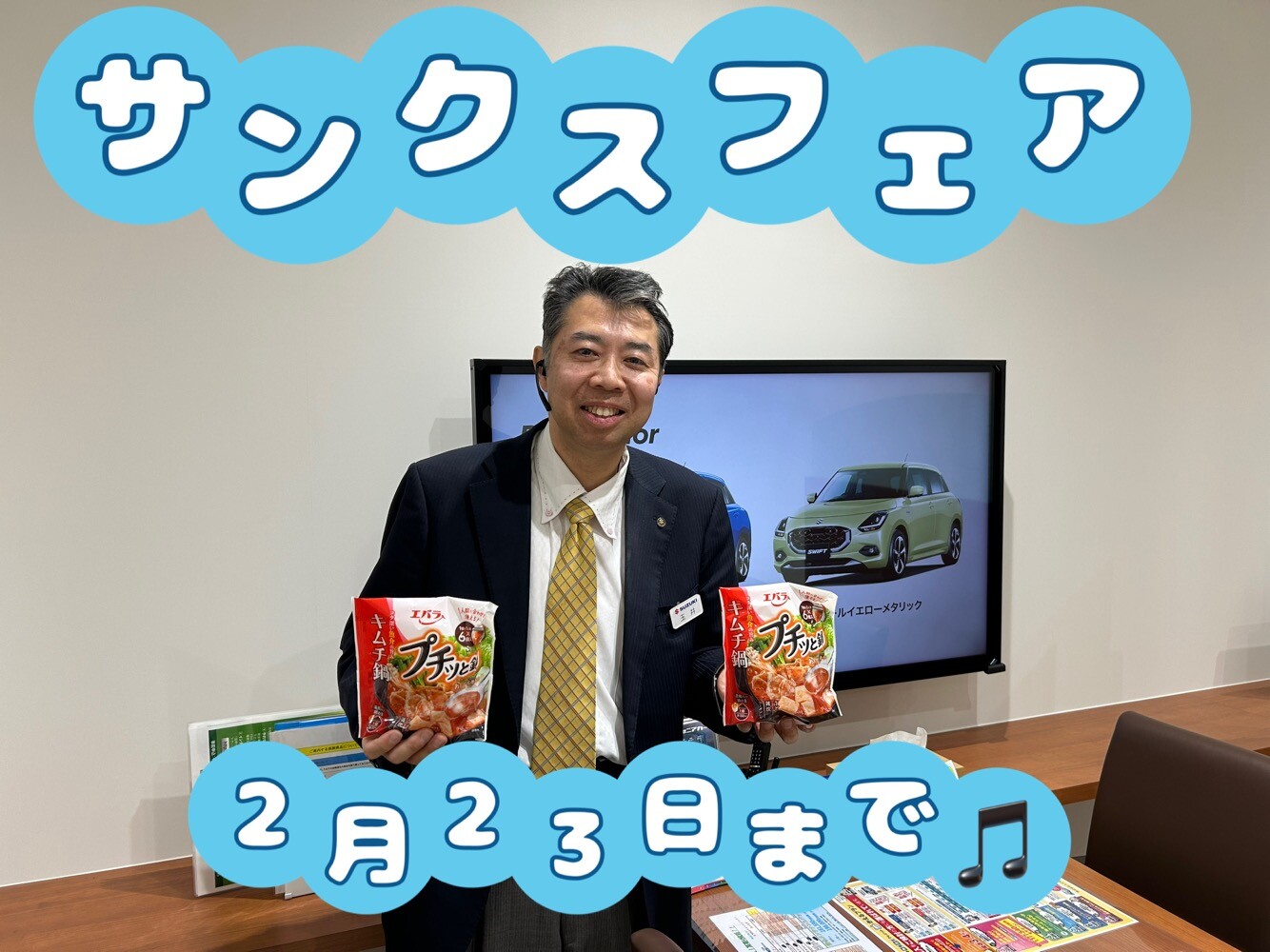 イベント/キャンペーン 2026.02.19 ~週末はサンクスフェア~ ※このイベントは終了しました いつも当店のHPをご覧いただきありがとうございます 今週末2月21日(土)~2月23日(月)の期間でサンクスフェアを実施致します 期間内にご来場いただいて、見積・試乗・査定した方に プチッと鍋 or おにぎリッチ をプレゼントしています また、ただいまの期間、当店でスズキのEV「eビターラ」が試乗できます ※試乗車は2月22日(日)までのご用意となります 皆様のご来店、心よりお待ちしております
