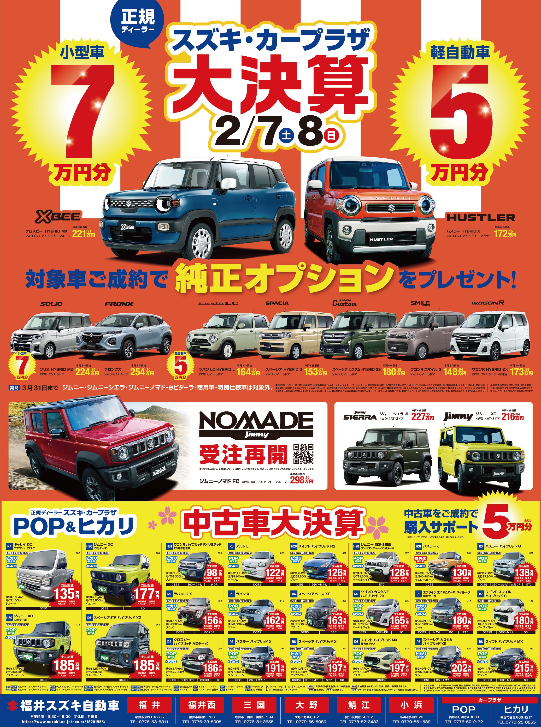 イベント/キャンペーン 2026.02.05 スズキ・カープラザ大決算!! 皆さま、こんにちは! カープラザ福井です。 今週末のイベント情報です 2月7日(土)、8日(日) スズキ・カープラザ大決算 新車ご成約で 軽自動車 5万円 小型車 7万円分 純正オプションをプレゼント ※ジムニー・ジムニーシエラ・ジムニーノマド・eビターラ・商用車・特別仕様車は対象外です。 さらに 中古車大決算も行います 中古車をご成約で 購入サポート5万円分をプレゼントいたします 皆さま、是非ご来店ください お待ちしております