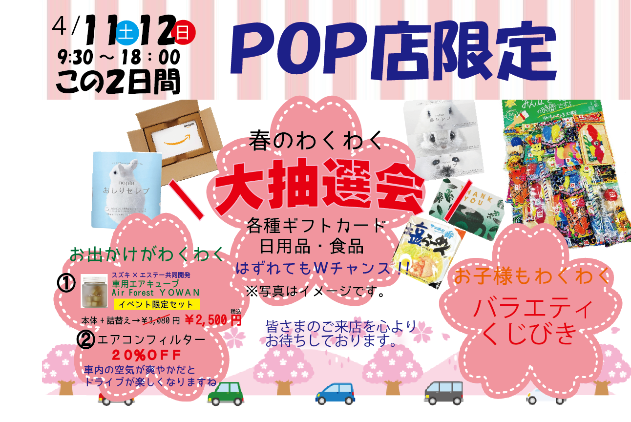 イベント/キャンペーン 2026.04.10 春の感謝祭~スプリングインチェック~ ※このイベントは終了しました こんにちは、カープラザPOP店です。 4月に入って、桜が咲いたかと思えば 強風と雨で満開の桜が散ってしまいましたね 三寒四温も続いています、着るもので調整して 楽しい春を過ごしましょう \ イベントのご案内 / 4月11(土)12(日) カープラザ全店で感謝祭がおこなわれます。 お店によって、イベント内容がことなりますのでご注意くださいませ。 POP店は「わくわく大抽選会」を開催します 何が当たるかお楽しみに! 皆様のご来店をスタッフ一同お待ちしております
