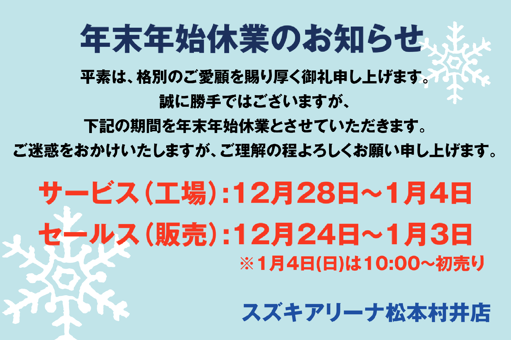 年末年始休業日のご案内