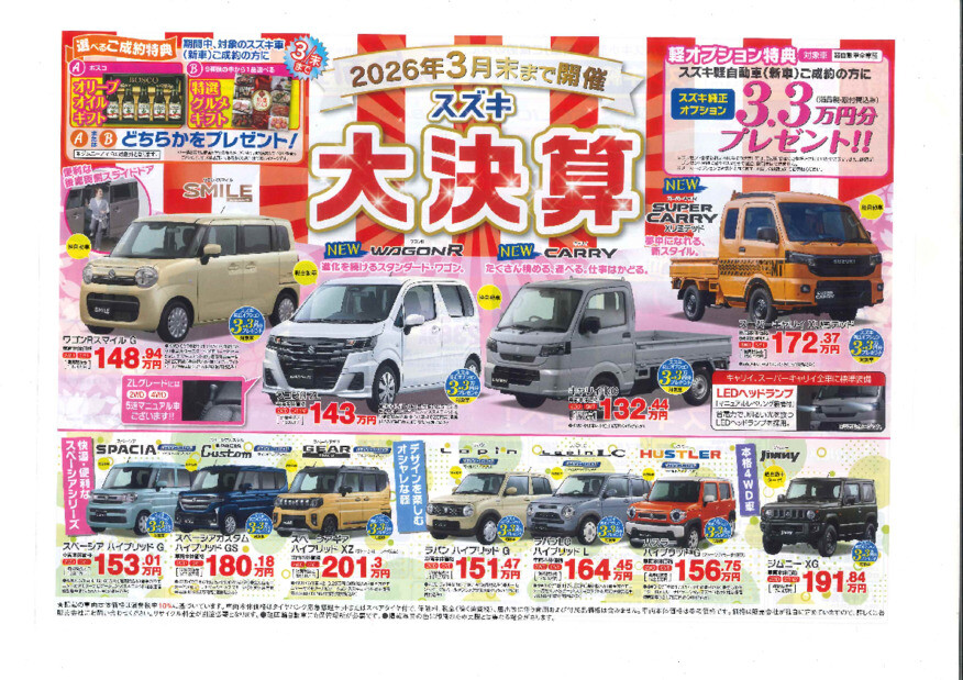 イベント/キャンペーン 2026.03.19 最後の週末は「大決算フェア」 皆さんこんにちは! 最近、暖かくなり春らしい気候になってきましたね! さて、 3月も最後の週末ですね!! 3月30日までですが、大決算フェア開催中です!! クロスビー、ソリオ、スペーシア かえるプラン金利2.9% 小型車ご成約で5.5万円分 軽自動車ご成約で3.3万円分 プレゼント!! ご成約プレゼント 選べるギフト or オリーブオイル この週末はスズキへGO