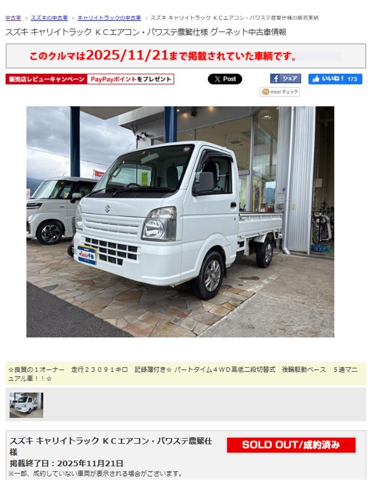 走行23,031キロの掘り出しモノのキャリートラックが売約済みとなりました\(^o^)/