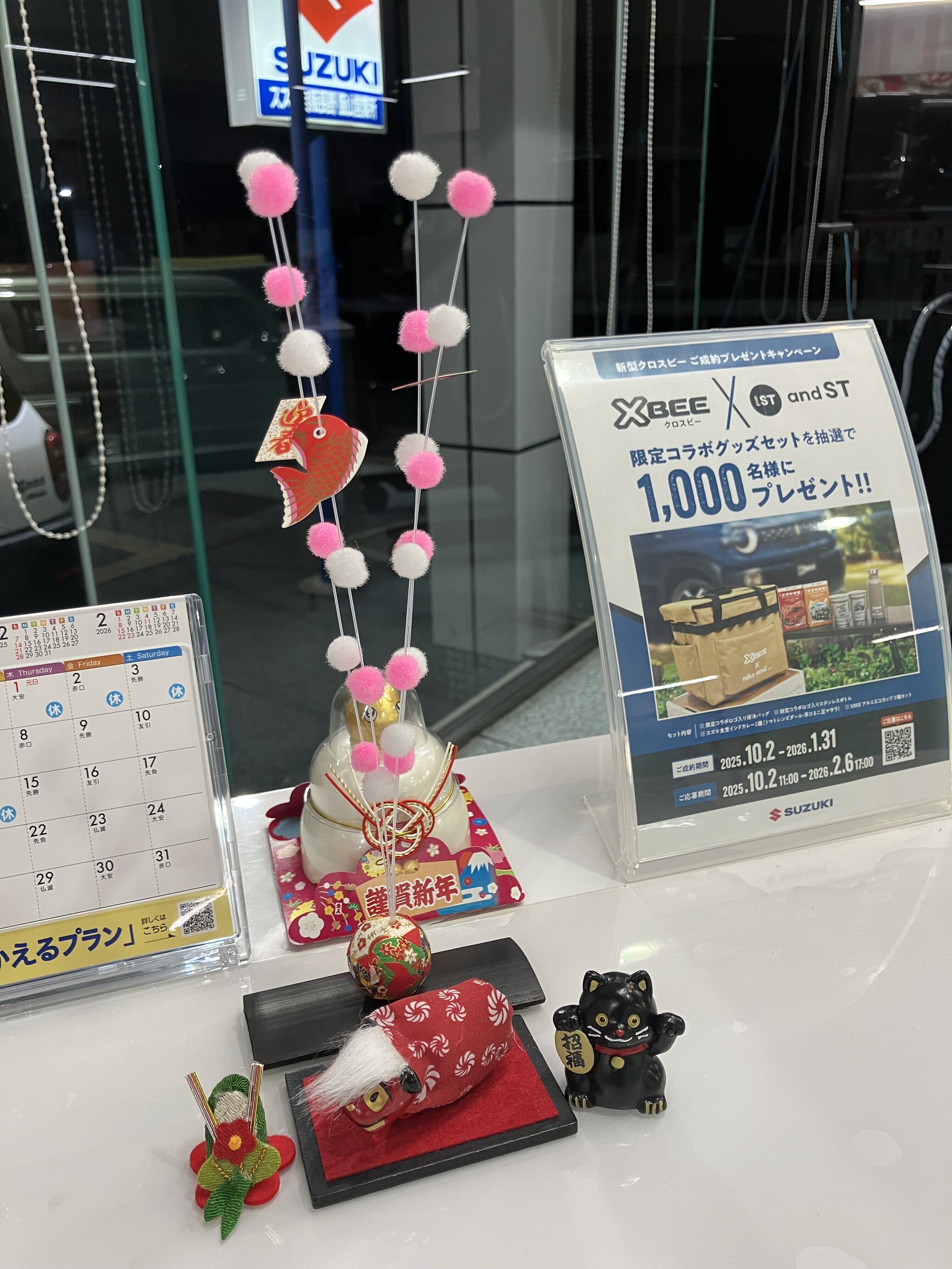 イベント/キャンペーン 2025.12.25 今年もやります。スズキの初売り1/4から キャンペーン期間:2026.01.04~2026.01.12 飯山店のブログをご覧いただきありがとうございます。 今年もやります。スズキの初売り 1月4日から1月12日まで 特典ご用意してます ご来店お待ちしております。 2026年1月12日までにご成約のお客様へ 国産和牛カタログギフト プレゼント ショールームもこんな飾りで お出迎え 特典盛沢山なこの機会にぜひご来店ください! お待ちしております