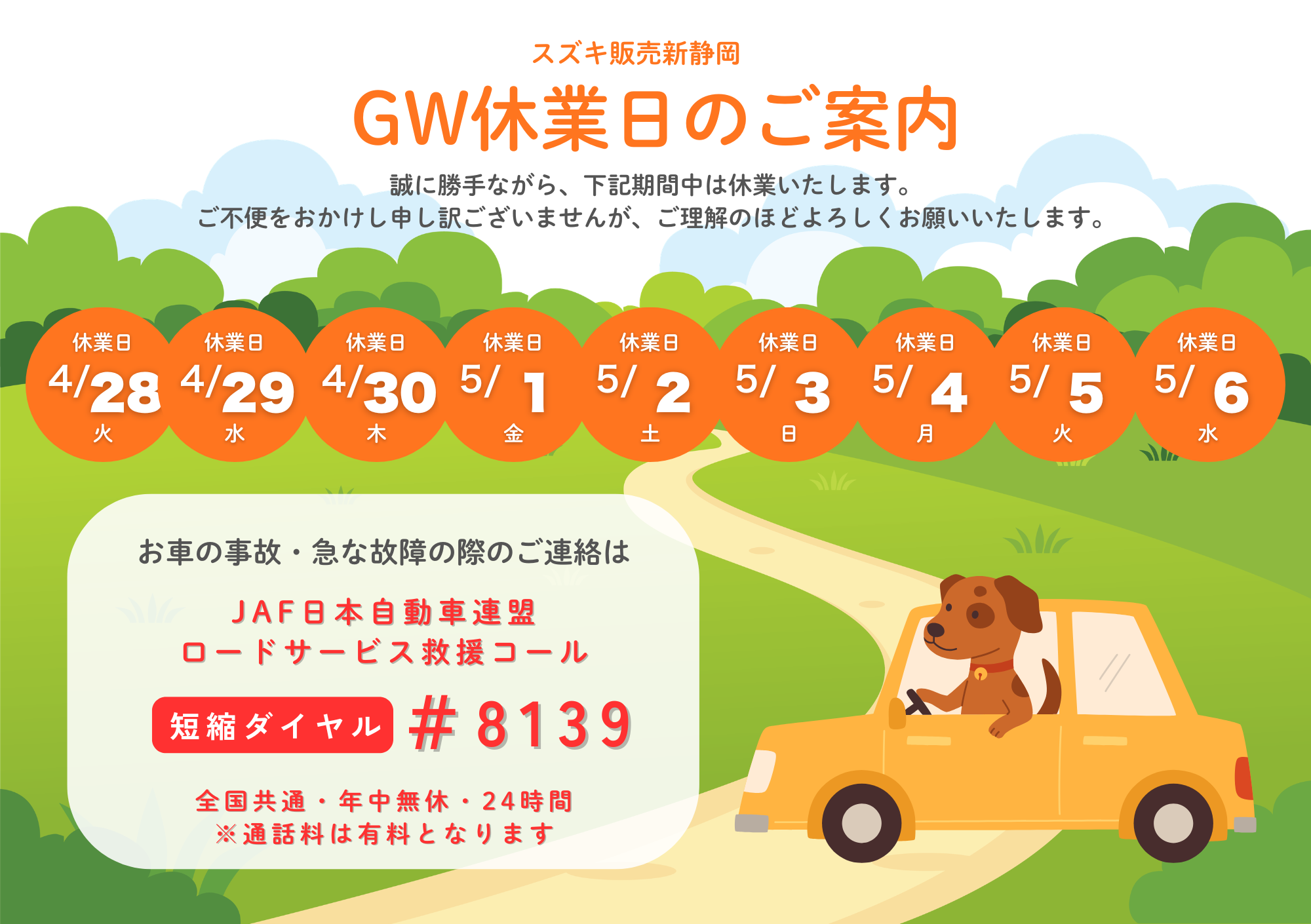 その他 2026.04.26 ◆ゴールデンウィーク休業日のご案内◆ 休業期間:4/28(火)~5/6(水) 誠に勝手ながら上記期間中は休業いたします。 ご不便をおかけし申し訳ございませんがご了承くださいませ。 お車の故障等でお急ぎの場合はJAFをご利用ください。 JAF日本自動車連盟ロードサービス救援コール 全国共通・年中無休・24時間 短縮ダイヤル #8139