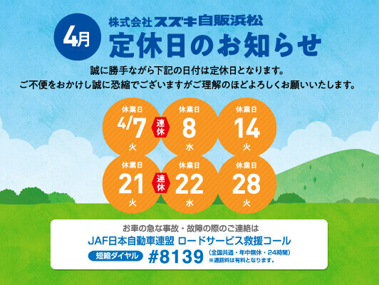 その他 2026.04.06 定休日のお知らせです 4月の定休日のお知らせです。 誠に勝手ながら、4月7日(火)・4月8日(水)は連休とさせて頂きます。 お車の急な故障の際は ※JAF日本自動車連盟ロードサービス #8139 までご連絡下さい。 4月9日(木)より通常営業致します。 ご不便をおかけし誠に恐縮ではございますが、ご理解の程よろしくお願い致します。
