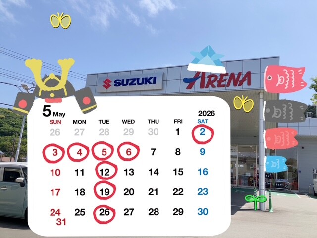 その他 2026.04.27 5月の休業日のおしらせ★ 日頃は、スズキアリーナ伊東をご利用いただきまして誠に有難うございます。 5月は2日~6日のゴールデンウィーク期間と 毎週火曜日が休業で御座います。 お車の故障、トラブルの場合は JAF 0570-00-8139または #8139まで御連絡下さい ご不便をお掛けしてしまい申し訳ございませんが、宜しくお願い致します。