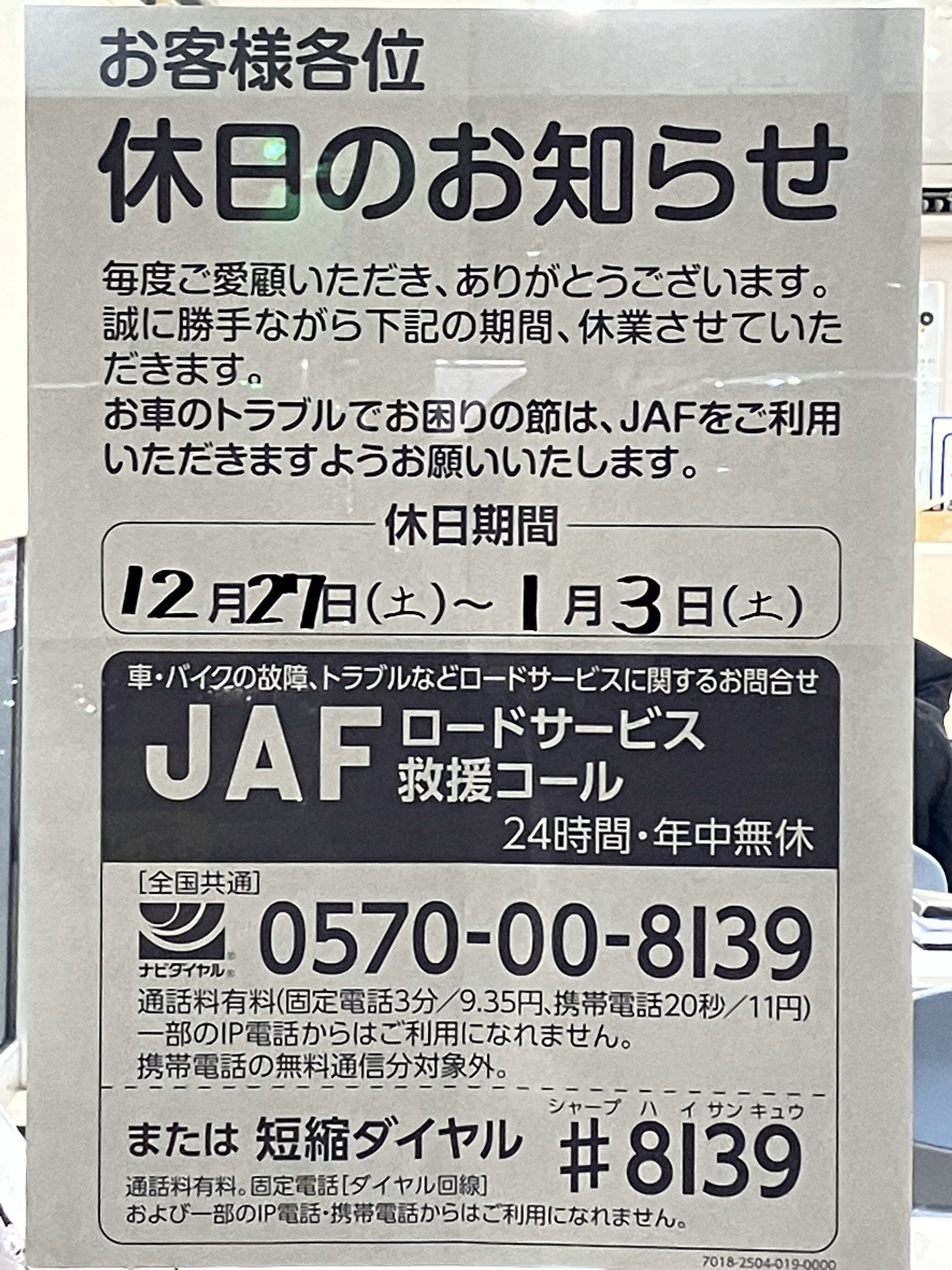 冬季休業中の事故・故障等のお車のトラブルの際は以下のロードサービスまでご相談ください。