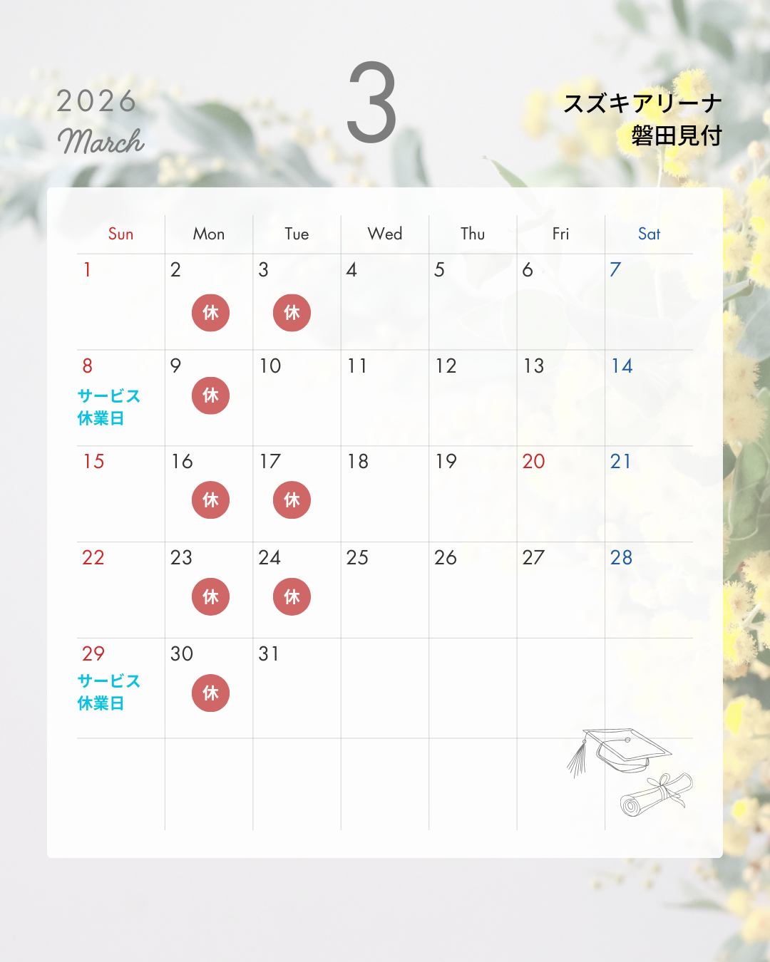 その他 2026.03.01 ♦ 3月休店日のご案内 ♦ 3月休店日のご案内 2日(月)・3日(火) 9日(月) 16日(月)・17日(火) 23日(月)・24日(火) 30日(月) 8日(日)・29日(日)はサービス工場休業日です ショールームは通常通り営業しております 休業中お車の故障等お困りの場合はJAFをご利用ください 連絡先 #8139または0570ー00ー8139 JAFご加入は当店でも承っております お気軽に営業スタッフまでお問い合わせください
