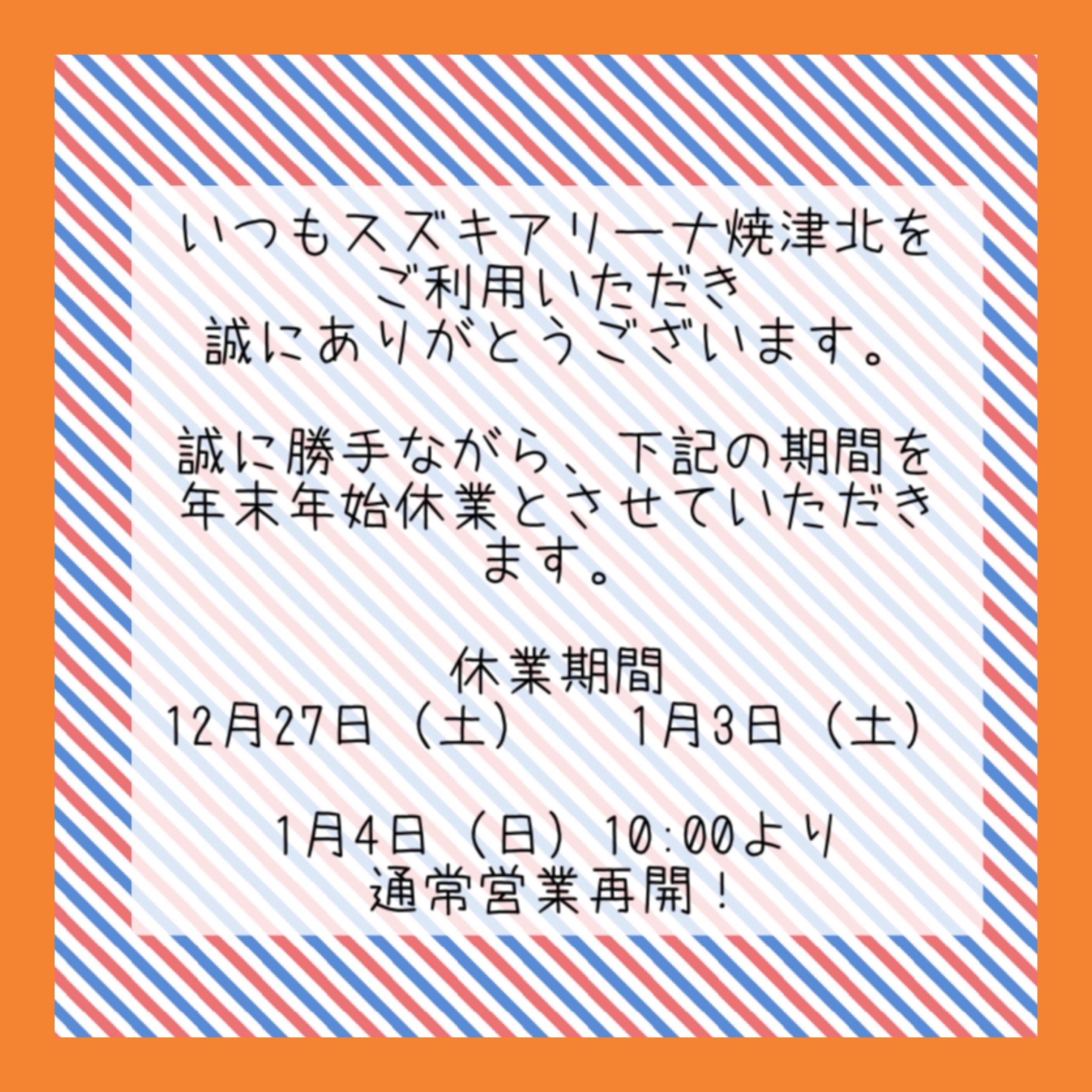 その他 2025.12.27 年末年始の休業案内 こんにちは、 スズキアリーナ焼津北です! 年末年始の営業について 改めてご案内いたします。 誠に勝手ながら、 12月27日(土)~1月3日(土)まで 年末年始休業とさせていただきます。 1月4日(日)10時より通常営業再開! そして同日からは 初売りがスタート 新年ならではのおトクな内容をご案内していますので ぜひ楽しみにしていてください! なお、休暇中のホームページからの 各種ご予約は当店での確認やご返答が 年明けの4日以降となりますのであらかじめご了承ください。