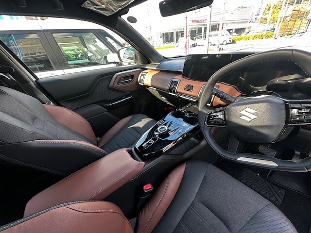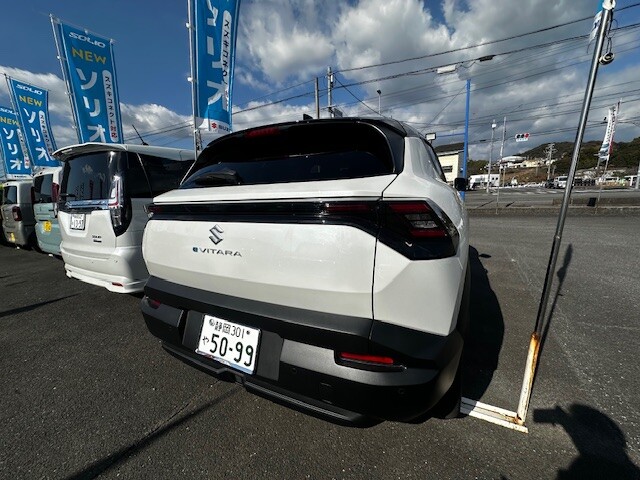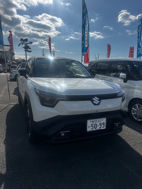 新車情報 2026.01.28 eビターラ、試乗できます スズキ初の電気自動車「eビターラ」当店にて試乗車をご用意いたしました♫ 迫力があり、大きなタイヤ、力強い見た目でとってもかっこいいです(^^) 色は アークティックホワイトパールブラック2トーン です!! 内装はブラウン、ブラックの高級感のあるインテリアです 天井はガラスルーフで解放感があります♫ これでドライブも気持ちよく、たのしくなりそうです(^^) ドライブ好きさんにはうれしいですね☆☆ かなり静かでスタッフみんな驚きました! ぜひ、ご試乗してみてくださいね!