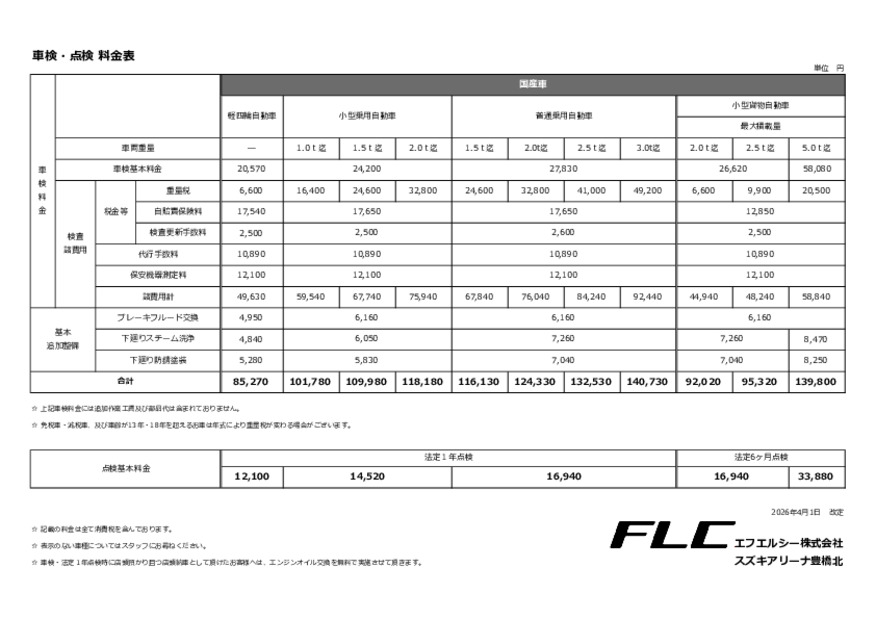 その他 2026.04.01 国産車点検整備費用一覧 こんにちは!スズキアリーナ豊橋北です! よくお問い合わせをいただく、点検費用に関して、 一覧をご用意いたしましたので、ご確認をいただければと思います こちらを参考にしていただき、是非、定期的な点検のご入庫をご検討ください ご不明点はお気軽にスタッフまでお問い合わせください スズキアリーナ豊橋北 0532-52-1521 toyohashi@f-l-c.jp 10:00~19:00 (水曜定休)