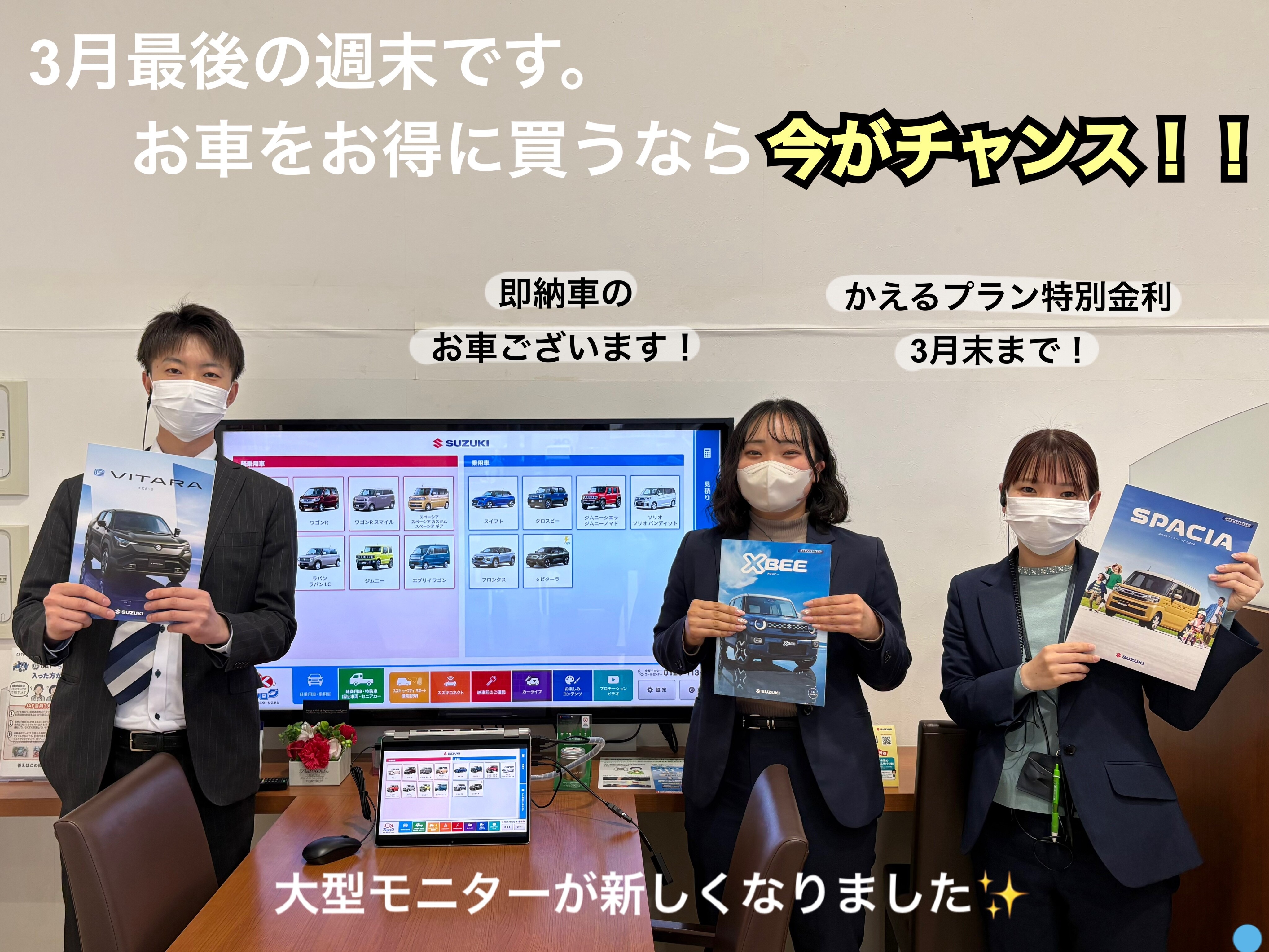 その他 2026.03.26 3月最後の週末です(^^)/ こんにちは!アリーナ豊橋南店です(^^)/ 桜が咲き始め、暖かくなってきて 靴や服など何かと 新調したくなる季節ですね 3月決算 最後の週末です 車をお得に買うなら今! スペーシアやラパンなど人気車種も 即納車がございます(^^)/ かえるプランの特別金利も 今月末までの申し込みとなっております また、ショールームでは4月から 12:00~13:00の1時間 昼休業を取らせていただきます オイル交換、点検等のご予約は スズキマイページからネット予約も承っております ぜひご利用ください