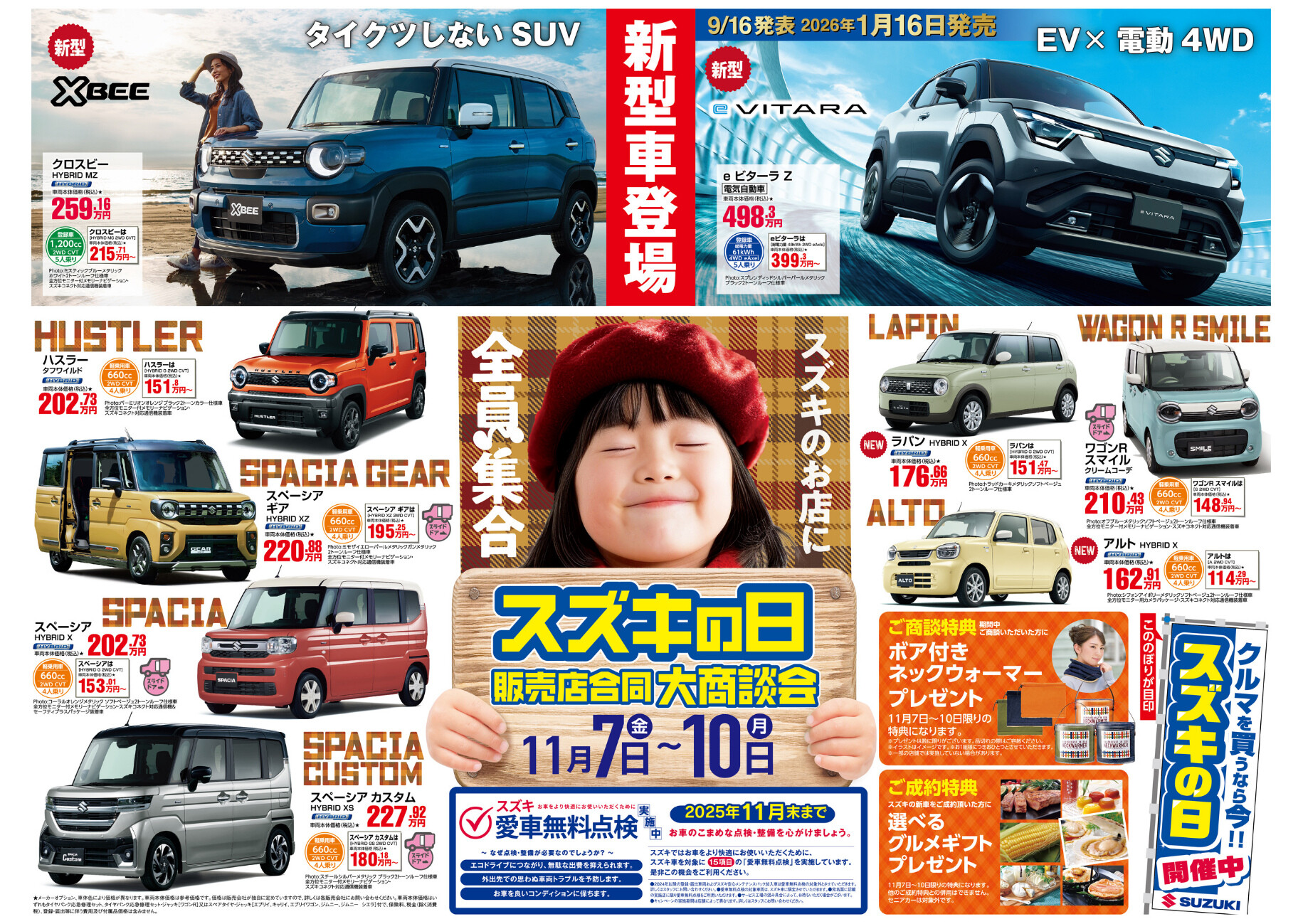 イベント/キャンペーン 2025.11.04 スズキの日!お得なキャンペーンのお知らせ キャンペーン期間:2025.11.07~2025.11.10 イベントのお知らせです 11月7日(金)~11月10日(月) 「スズキの日」を開催いたします ご商談記念特典 ボア付きネックウォーマー ご成約特典 選べるグルメギフト ぜひお越しください! 試乗や見積もりのご希望の方は 事前にお問い合わせいただけると幸いです ※ご予約優先でご案内しております ご了承ください ご来店お待ちしております