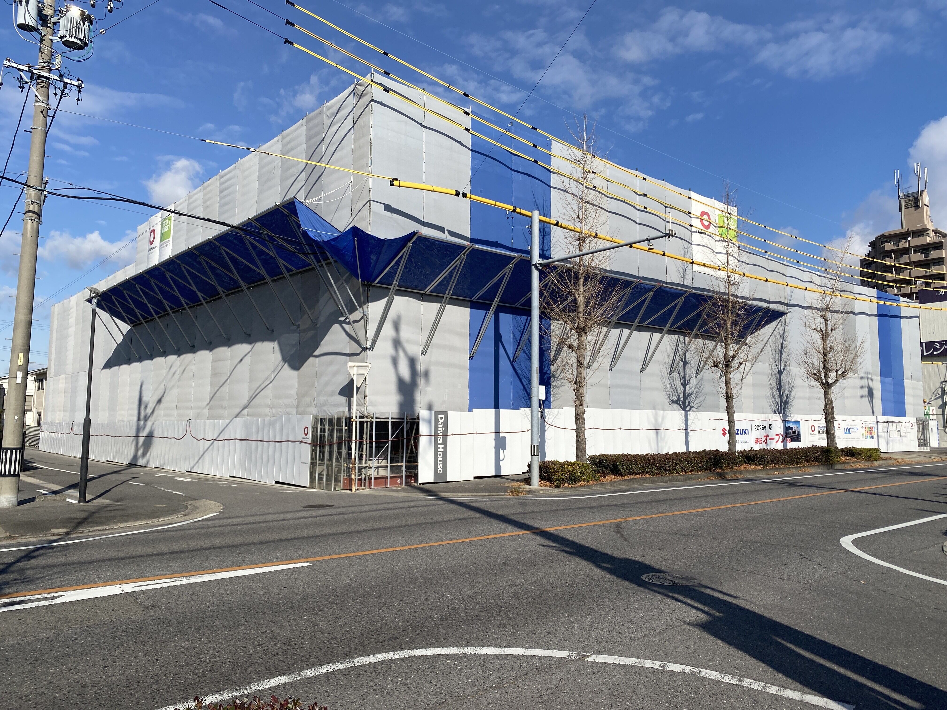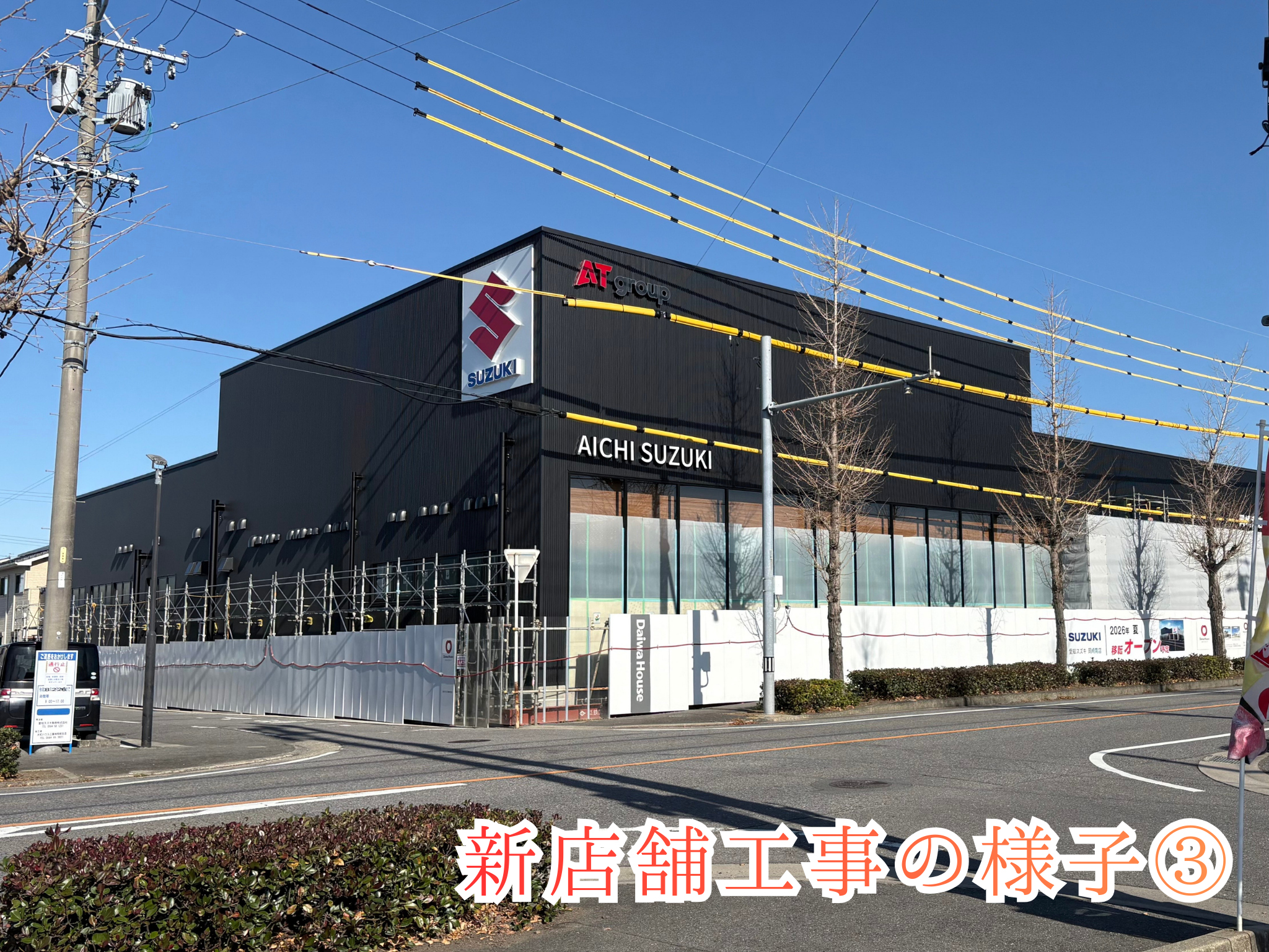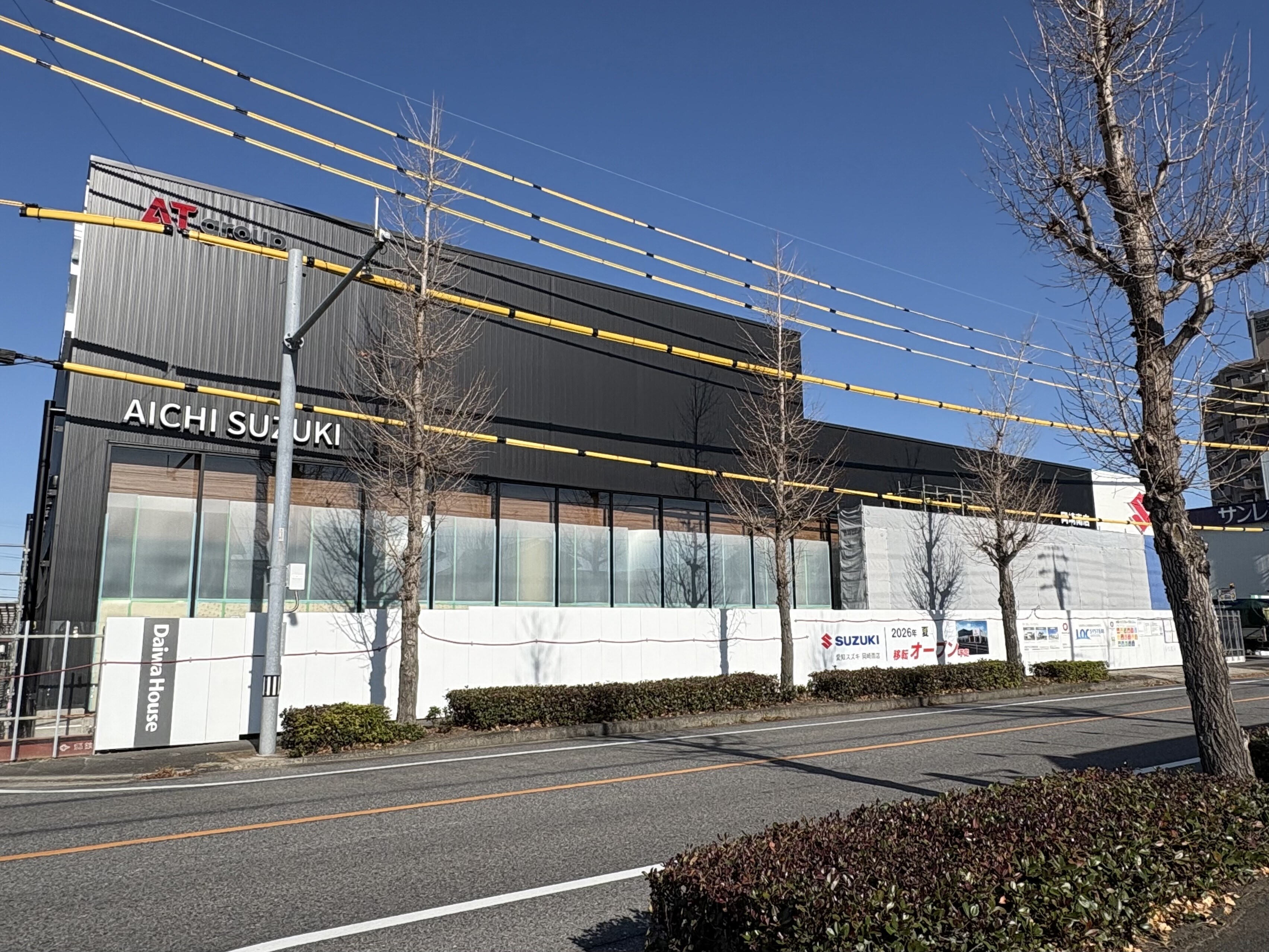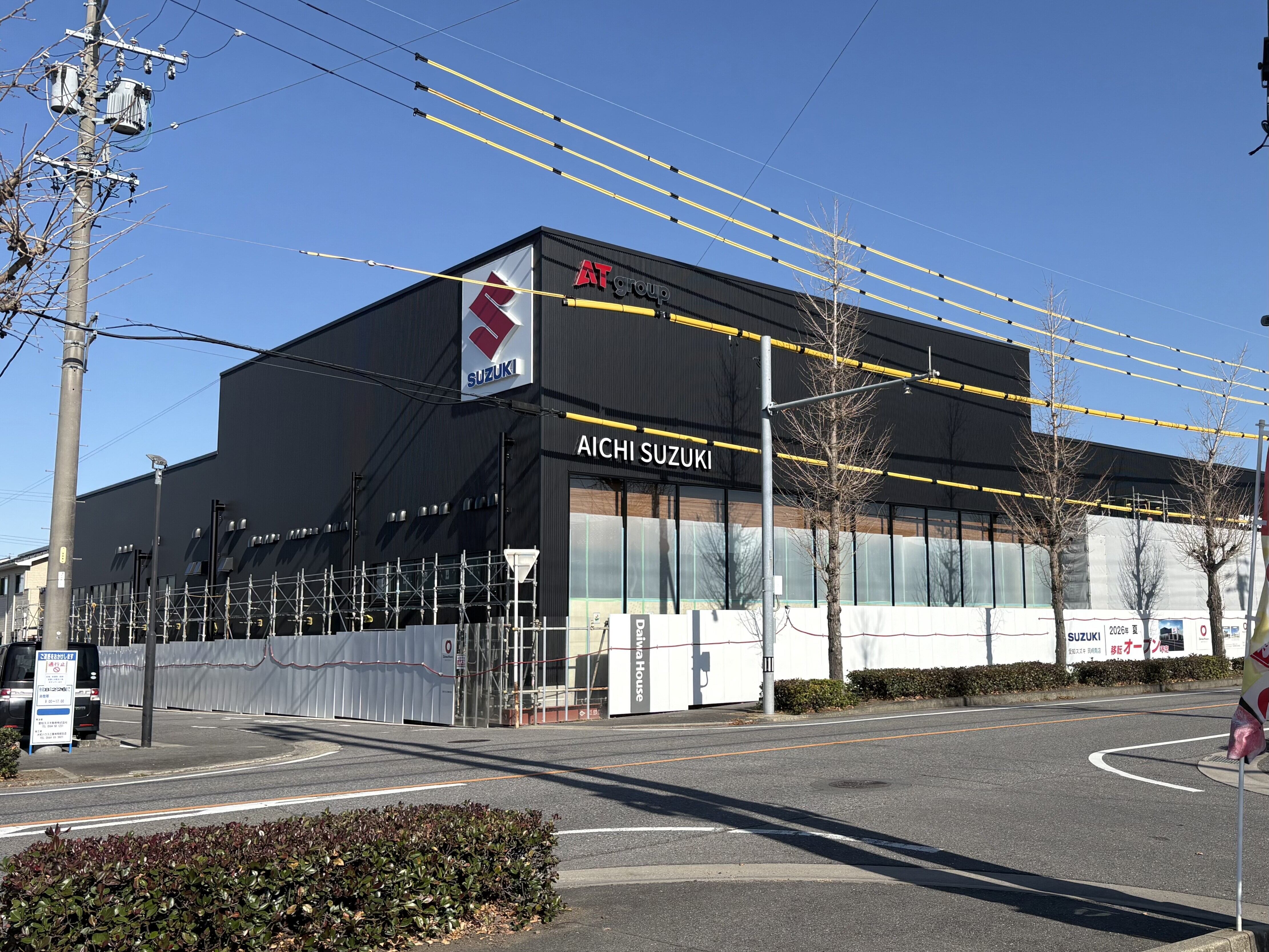 その他 2026.02.28 【新店舗工事状況その③】ついに全貌が明らかに!? こんにちは 愛知スズキ岡崎南店 くすのきです 皆様お待ちかねの 新店舗の工事状況です! 前回は屋上駐車場について 紹介しましたが 今回は外壁を覆っていたシートが撤去され 全貌がほぼ見えてきました! 2026年1月頃↓ 2026年2月末↓ ブラックの建物に のエンブレムが映えて スタイリッシュな印象です! 3月からは内装の工事を進めていくようです 7月オープンまで4カ月! お楽しみに
