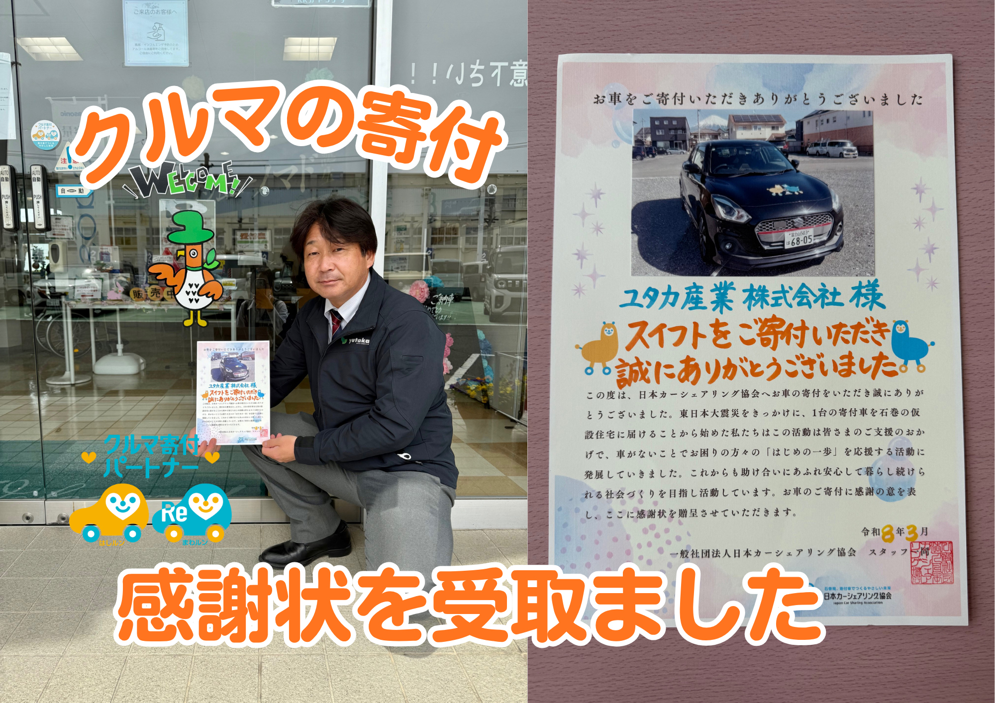 その他 2026.04.15 クルマの寄付、感謝状を頂きました! いつもブログをご覧いただき、ありがとうございます 先日のクルマの寄付により 日本カーシェアリング協会から感謝状が届きました! 寄付したクルマは「豊橋ナンバー」から「富士山ナンバー」へ変わり 新たなスタートを迎えたそうです。 必要としている方々へ使ってもらい、役に立ちますように… 頂いた感謝状は豊橋店の店内に掲示致します。
